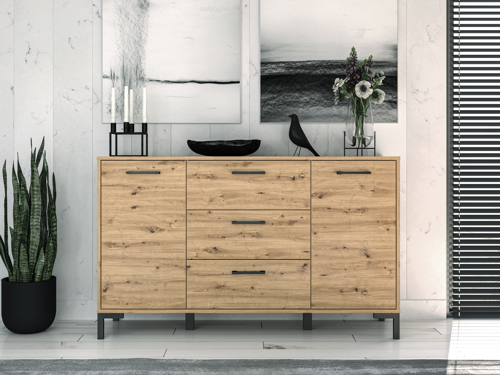 Komoda NEVIO12 to niezwykle praktyczne rozwiązanie do każdego wnętrza. Pięknie usłojony dekor w kolorze Dąb Artisan oraz czarne elementy w postaci uchwytów i nóżek tworzą nietuzinkowe połączenie. Komoda dzięki swojej funkcjonalności jest doskonałym miejscem do ekspozycji zdjęć, czy pamiątek rodzinnych. Bardzo pojemne półki są idealnym rozwiązaniem do umieszczenia ubrań. Ponadto komoda posiada trzy szuflady, które bez wątpienia sprawdzą się w przechowywaniu np. akcesoriów. Dodatkowo utrzymanie czystości nigdy nie było tak łatwe, dzięki wysokim nóżkom pod którymi zmieści się końcówka odkurzacza klasycznego, robot jeżdżący czy mop.
