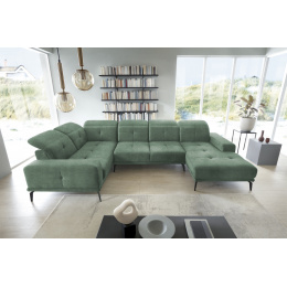 The Neviro corner sofa is a modern piece of furniture with ingenious features that make it much easier to relax. An interesting solution with which Neviro is equipped is the function of sliding backrests - which allows you to position your body comfortably. Smart, adjustable, headrests and a comfortable armrest increase comfort. The seat of the piece of furniture is made of HR high-flexible foam and corrugated spring, which makes the feeling of comfort even greater. Besides, Neviro offers an aesthetic experience thanks to stylish quilting and elegant stitching. Another distinguishing feature of the corner sofa is the high black steel legs. Neviro is a piece of furniture with dimensions: 350 x 201 x 77 cm.