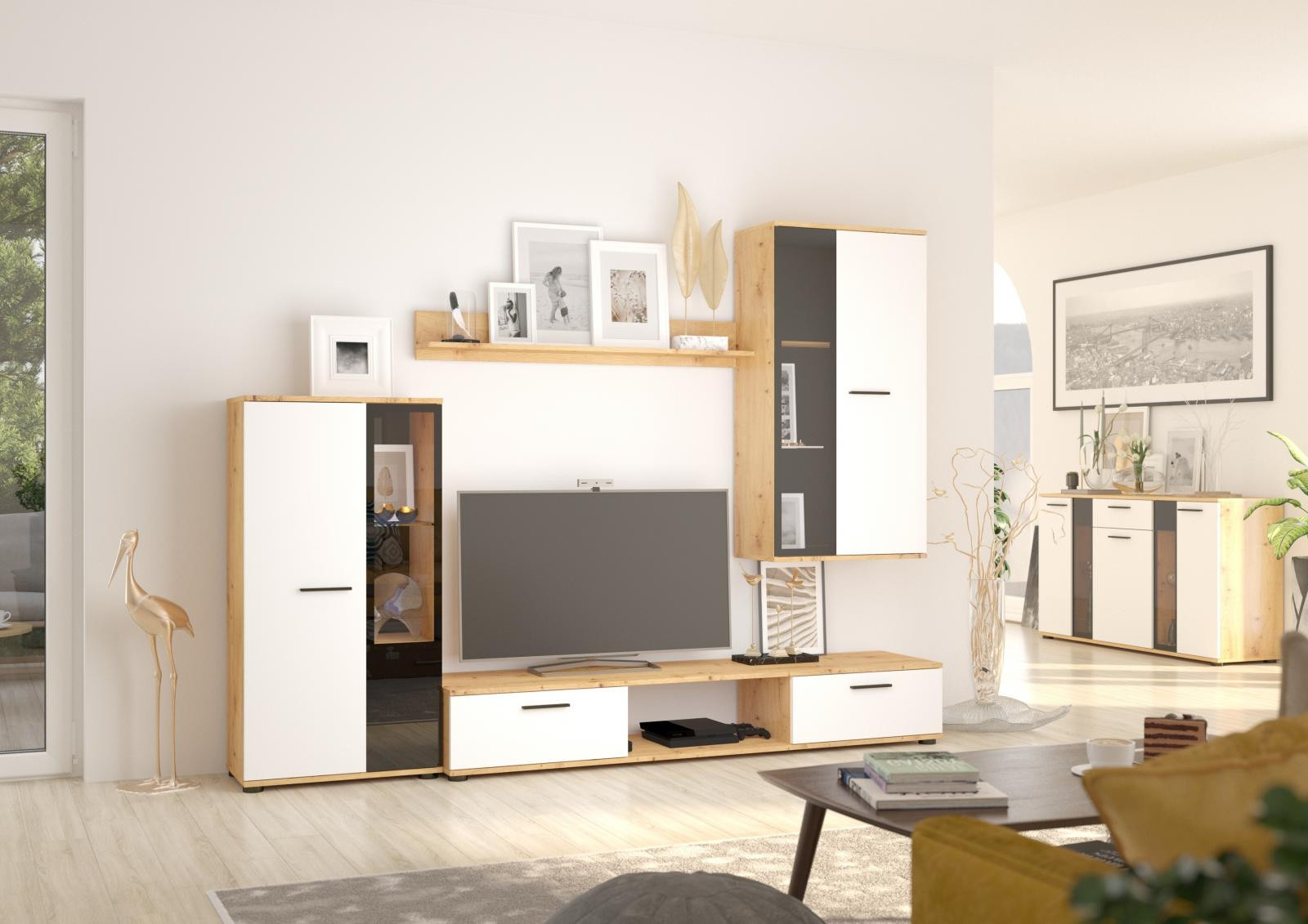 Obývací stěna Silos patří mezi oblíbené modely moderního nábytku. Nabízí dostatek úložného prostoru a je vhodná i do menších pokojů. Stěna je vyrobena z lamina, které je odolné a snadné na údržbu. Ke stěně nabízíme i komodu ve stejném provedení. Všechny prvky této sestavy jsou dodávány v demontu. Součástí je montážní plánek včetně všech potřebných spojovacích materiálů. Cena je uvedena za bytovou stěnu vyobrazenou na úvodní fotografii, bez komody, doplňků a dekorací. LED osvětlení není v ceně sestavy (lze dokoupit zvlášť). Vlivem nastavení monitorů, nebo displejů telefonů, se zobrazení barev na fotografii může od skutečnosti lišit.