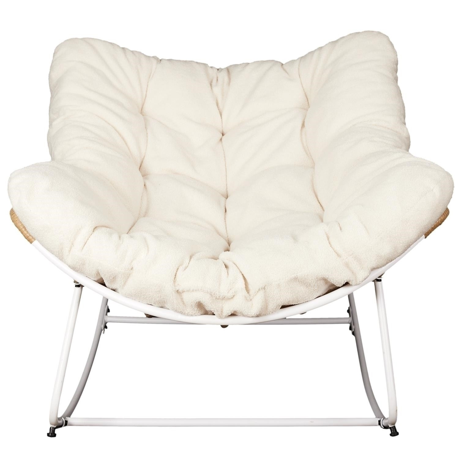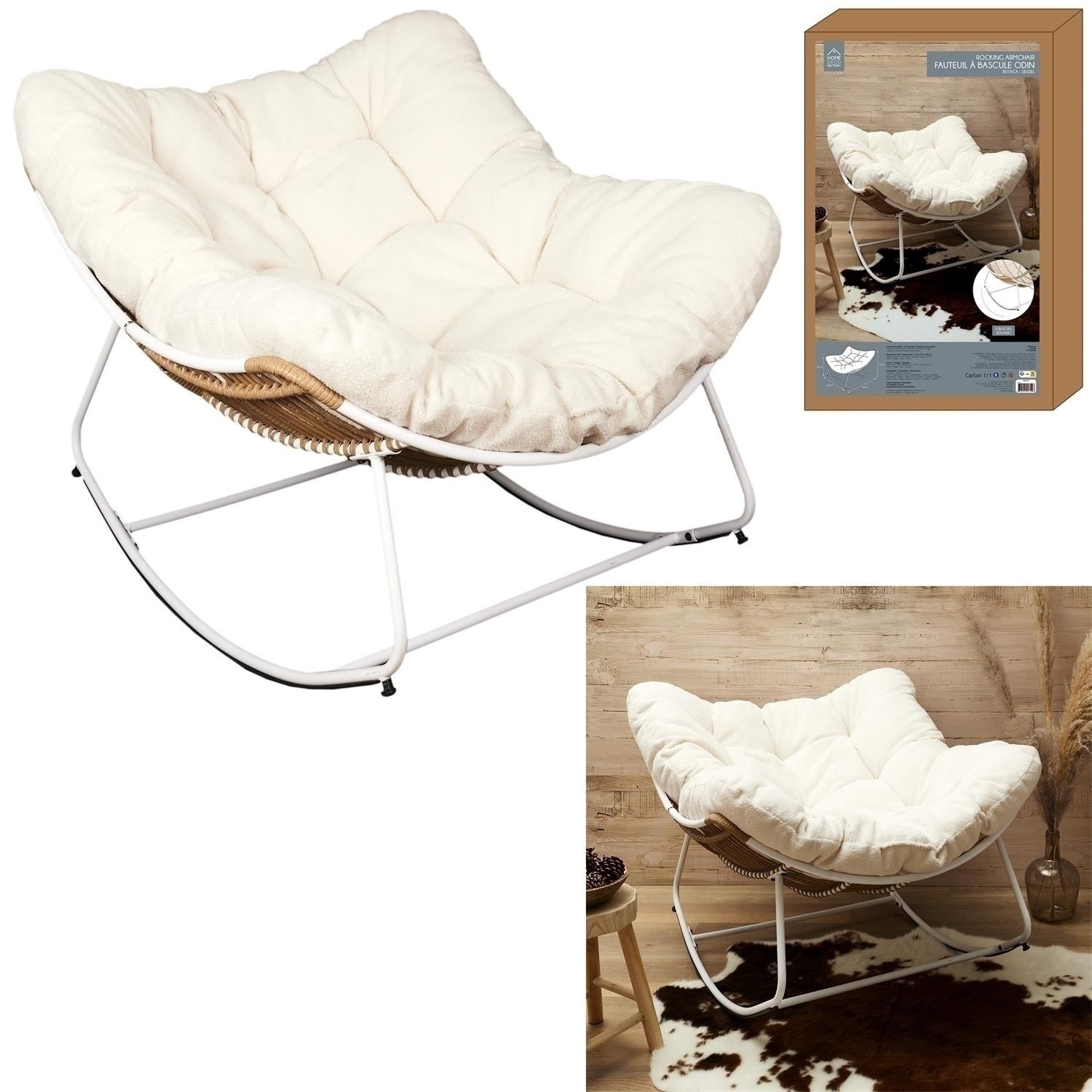 Az Odin szék kényelmes bútor fém síneken, amelyek lehetővé teszik a kényelmes pihenést enyhe hintázás közben. A szék ülőkéje fonott, műanyag rattanból készült. kagyló alakú kötött ülőke. Az ülés párnával volt ellátva. Puha, bolyhos párna, amelyet krémszínű teddy bear anyag borít, divatos bútorelem. A párna puha kárpitozó habbal volt kitöltve. A szék súlya 12,5 kg. Kartondoboz méretei: 97x65x40 cm. Maximális terhelés 110 kg. A fénykép külön összeszerelést igényel