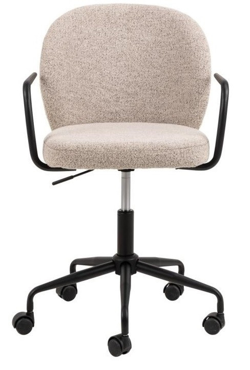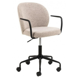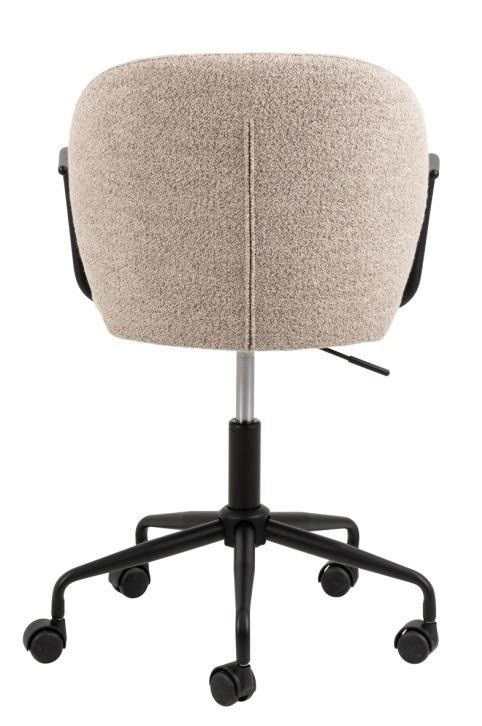 Az irodai szék kifinomult megjelenésével tűnik ki, lekerekített háttámlával, fekete cső alakú karfákkal és puha, bézs bouclé kárpitozással rendelkezik.