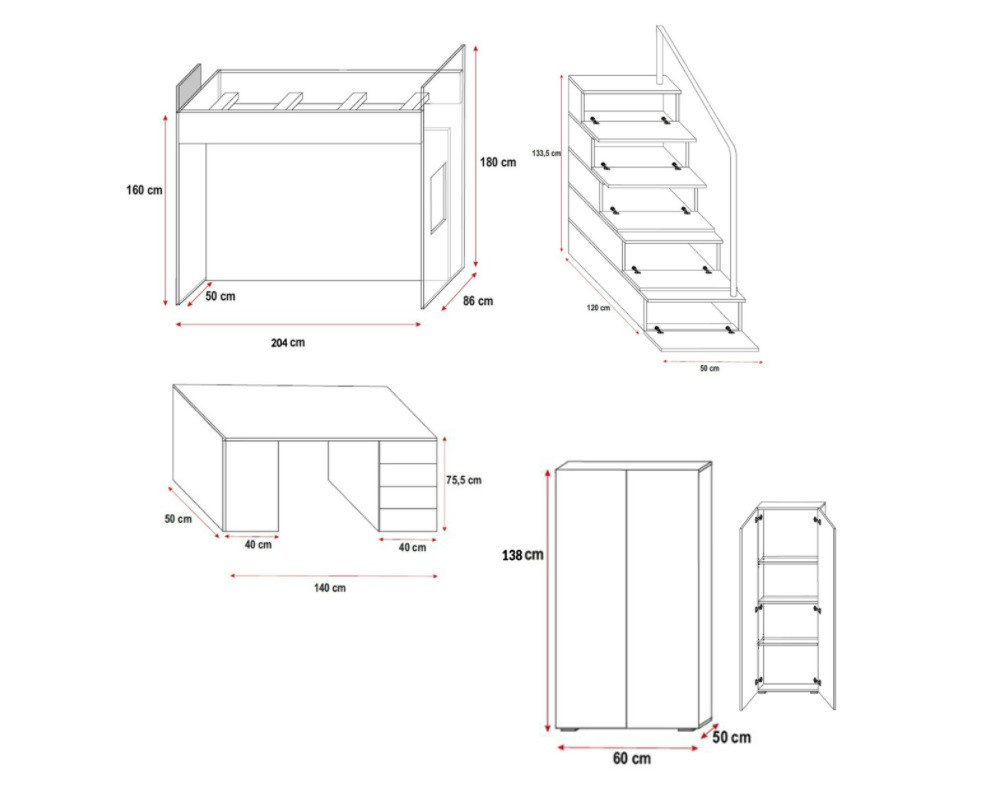 Celkové rozměry postele jsou 86 cm na šířku, 180 cm na výšku a 254 cm na délku. Tyto rozměry zajišťují, že postel poskytuje dostatek prostoru pro pohodlný spánek, zatímco její patrová konstrukce šetří místo v pokoji. Je ideální volbou pro menší pokoje, kde je potřeba efektivně využít každý centimetr.