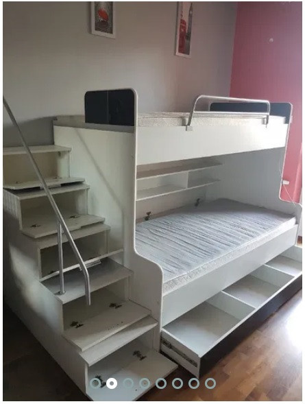 Tato patrová postel je určená především pro osoby, které ocení moderní design, funkčnost a spoustu úložných prostorů. Patentované provedení a stabilní konstrukce postele Vám zaručuje bezpečí pro Vaše děti. Schody v sobě ukrývají spoustu úložného prostoru. Barevné provedení dvířek je v lesku a schůdky lze objednat jak na pravou tak i levou stranu (stranu schodů určujeme z čelního pohledu). Nosnost každého lůžka je 80 kg, nosnost schodu je 55 kg. Pod spodním lůžkem je šuplík na lůžkoviny nebo hračky. Vedle spodního lůžka je ukryt úložný prostor po celé délce postele (viz. detail montážního plánku). K této posteli je možnost dokoupit další nábytek a utvořit tak krásný dětský pokoj.