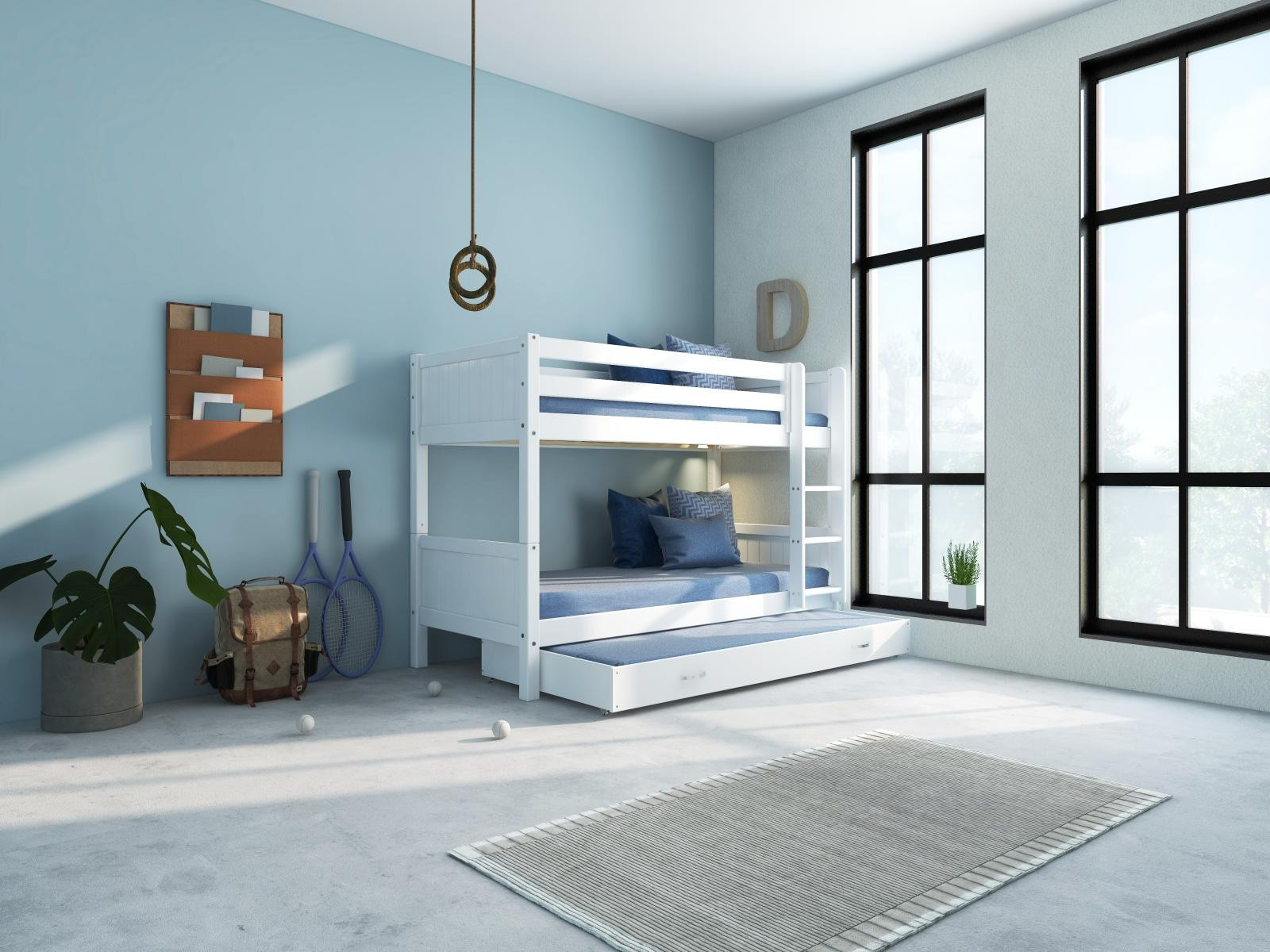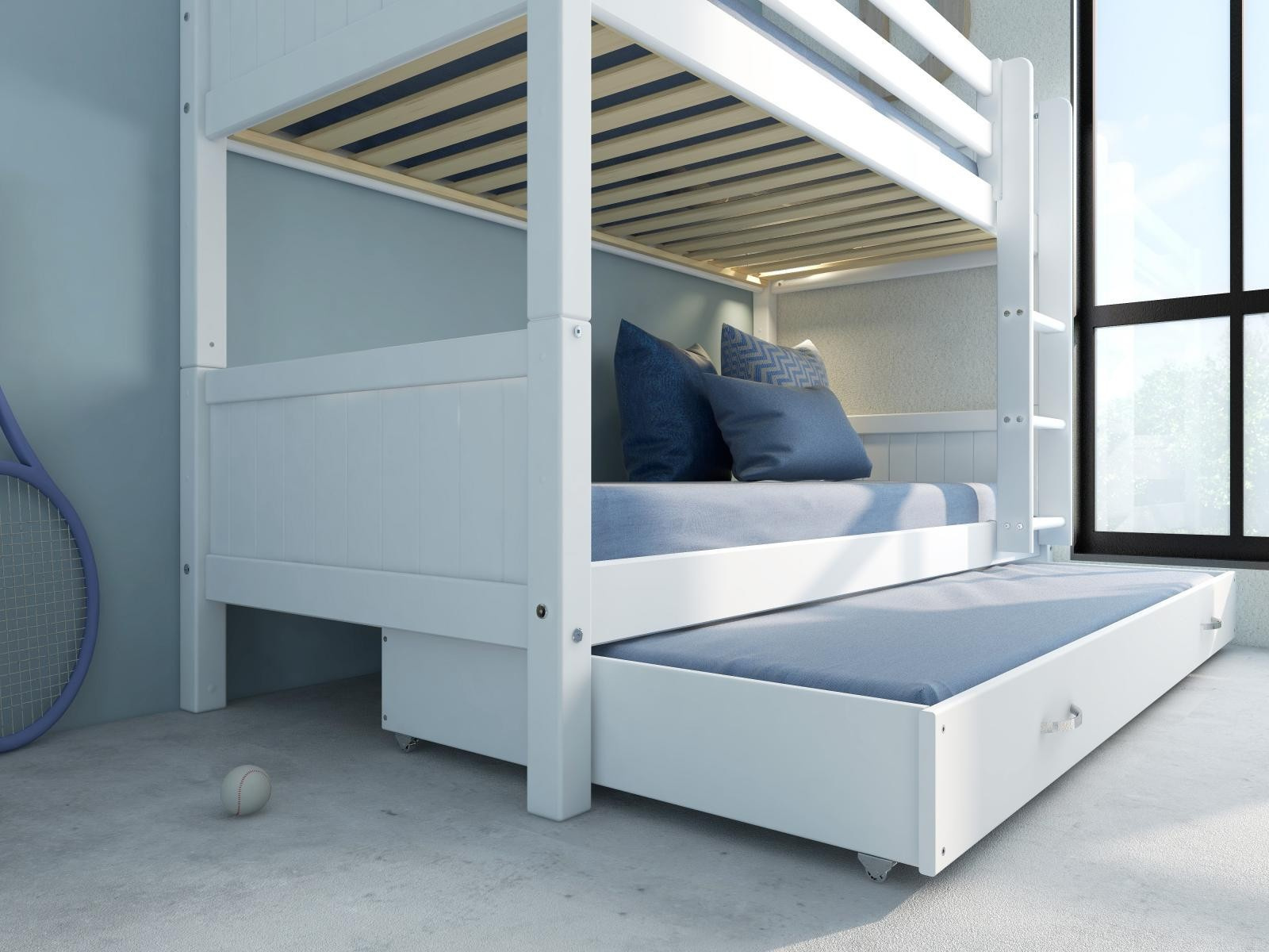 Doporučujeme dokoupit matrace: postel - 2ks 90 x 200 cm, přistýlka - 90 x 190 cm. Vhodná maximální výška matrace pro přistýlku je 12 cm. Součástí je schematický návod na montáž včetně všech spojovacích prvků. Vyobrazené doplňky a dekorace nejsou v ceně.