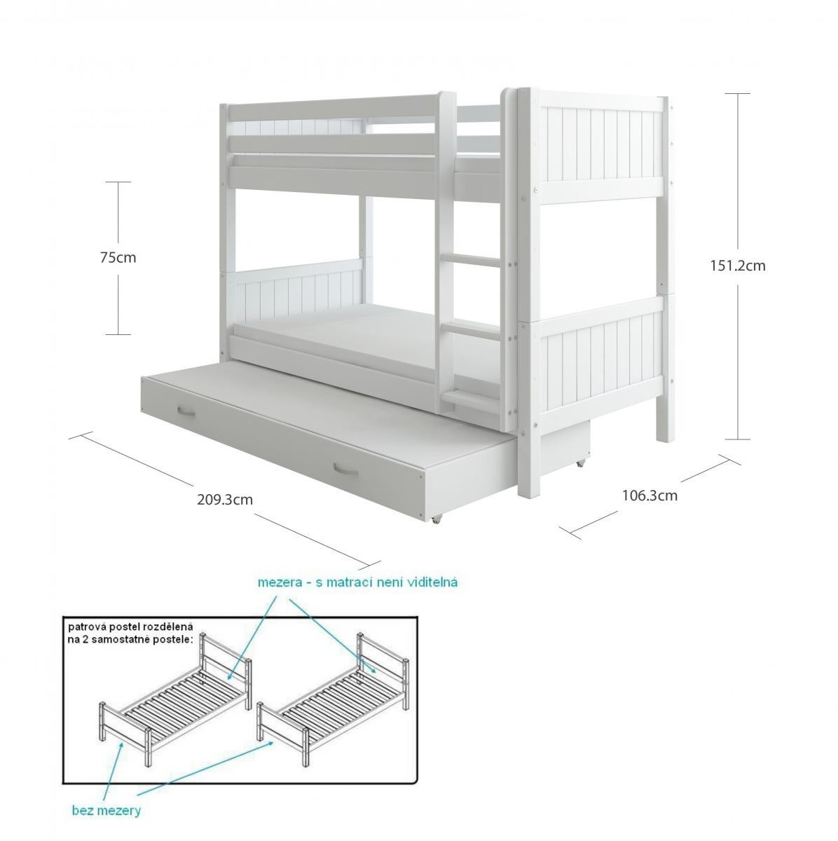 Patrová postel s přistýlkou Romantic je skvělým řešením, pokud sourozenci sdílejí pokoj – nebo potřebujete přistýlku pro časté návštěvy přátel a rodiny. Poskytuje maximální flexibilitu - podle potřeby může být ROZDĚLENA NA 2 SAMOSTATNÉ POSTELE.