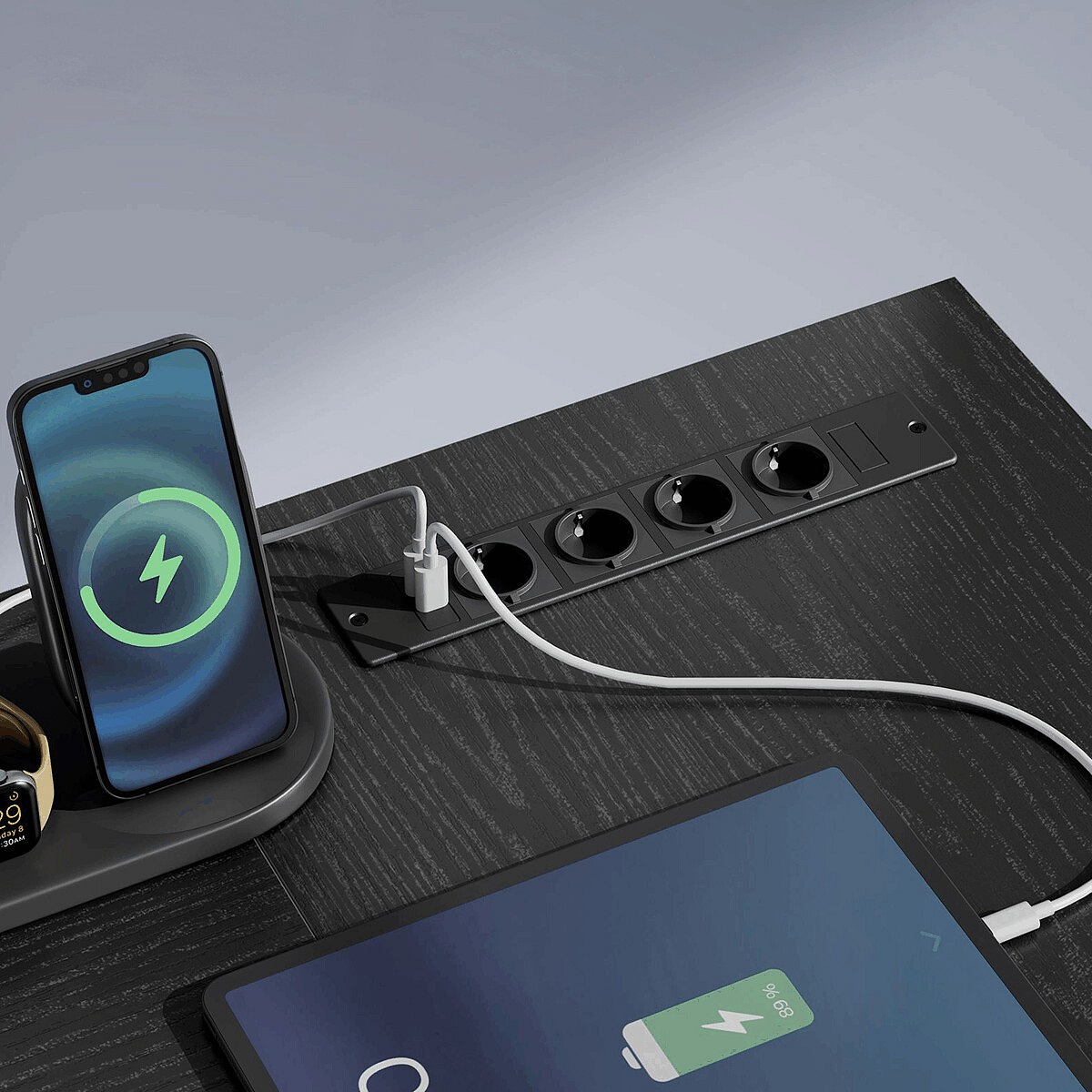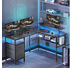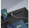Součástí stolu je integrované LED podsvícení s 20 barvami, 6 režimy blikání, 5 úrovněmi jasu a 5 rychlostmi efektů – vše snadno ovladatelné dálkovým ovladačem. Vestavěný napájecí panel nabízí 4 zásuvky a 2 USB porty pro pohodlné nabíjení notebooku, mobilu či dalších zařízení.