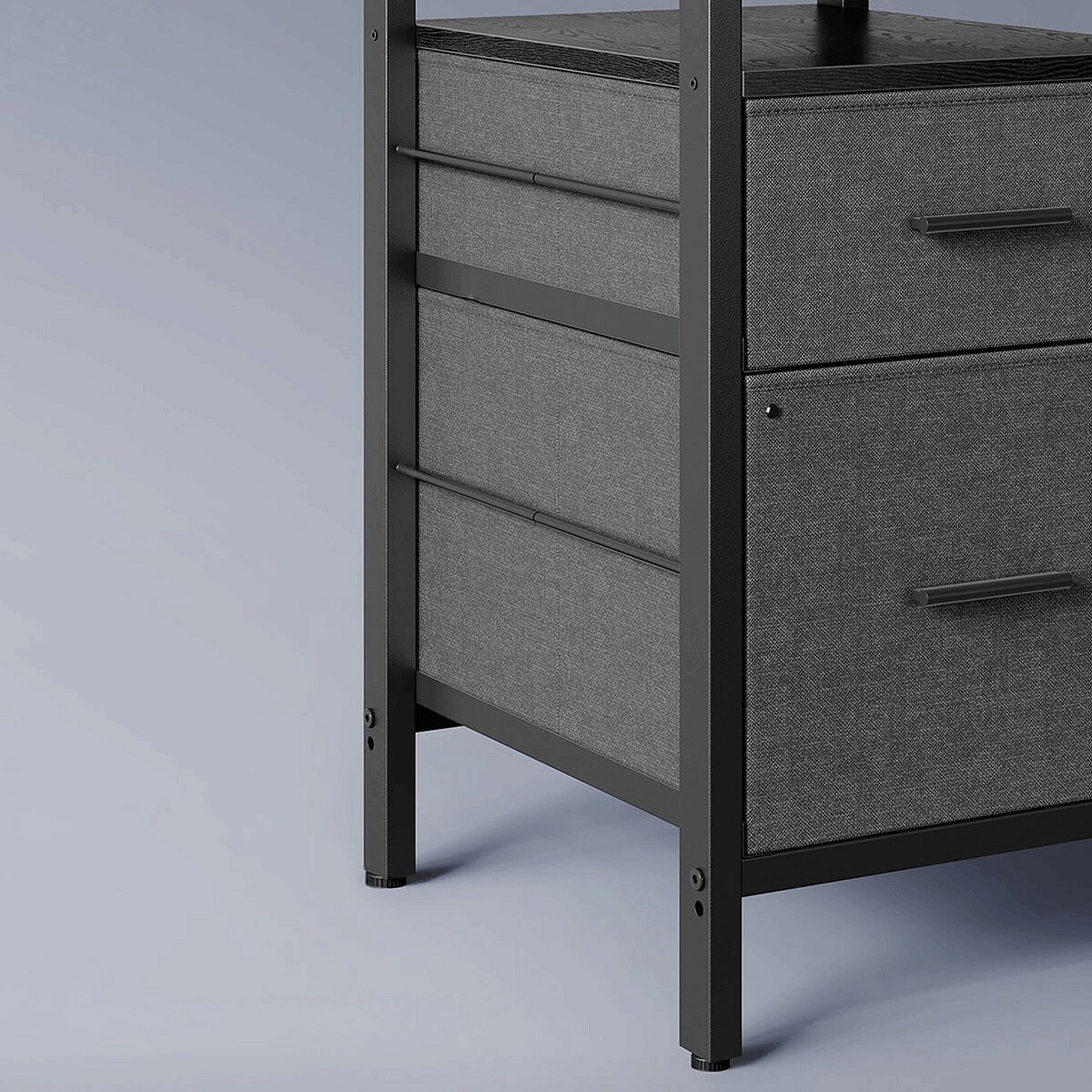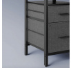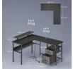 Dvě textilní zásuvky a spodní police poskytují praktické úložné prostory. Stabilitu zajišťuje ocelový rám s výztuží a výškově nastavitelné nožky. Stůl lze sestavit zrcadlově – zásuvky lze umístit vlevo i vpravo podle prostoru. Maximální nosnost pracovní plochy je 50 kg, stojanu na monitor 20 kg. Perfektní volba pro moderní kancelář, hernu i home office.
