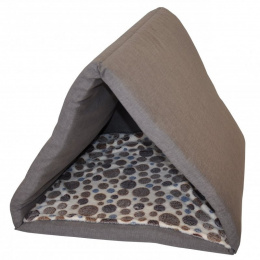 Trojúhelníkový pelíšek se stříškou pro Vaše domácí mazlíčky. | Velikost pelíšku je 60x60 cm. Celková výška je 52 cm. Pelíšek je vyplněný 100% polyesterovým vlákem. Součástí pelíšku je hřejivá fleecová deka.