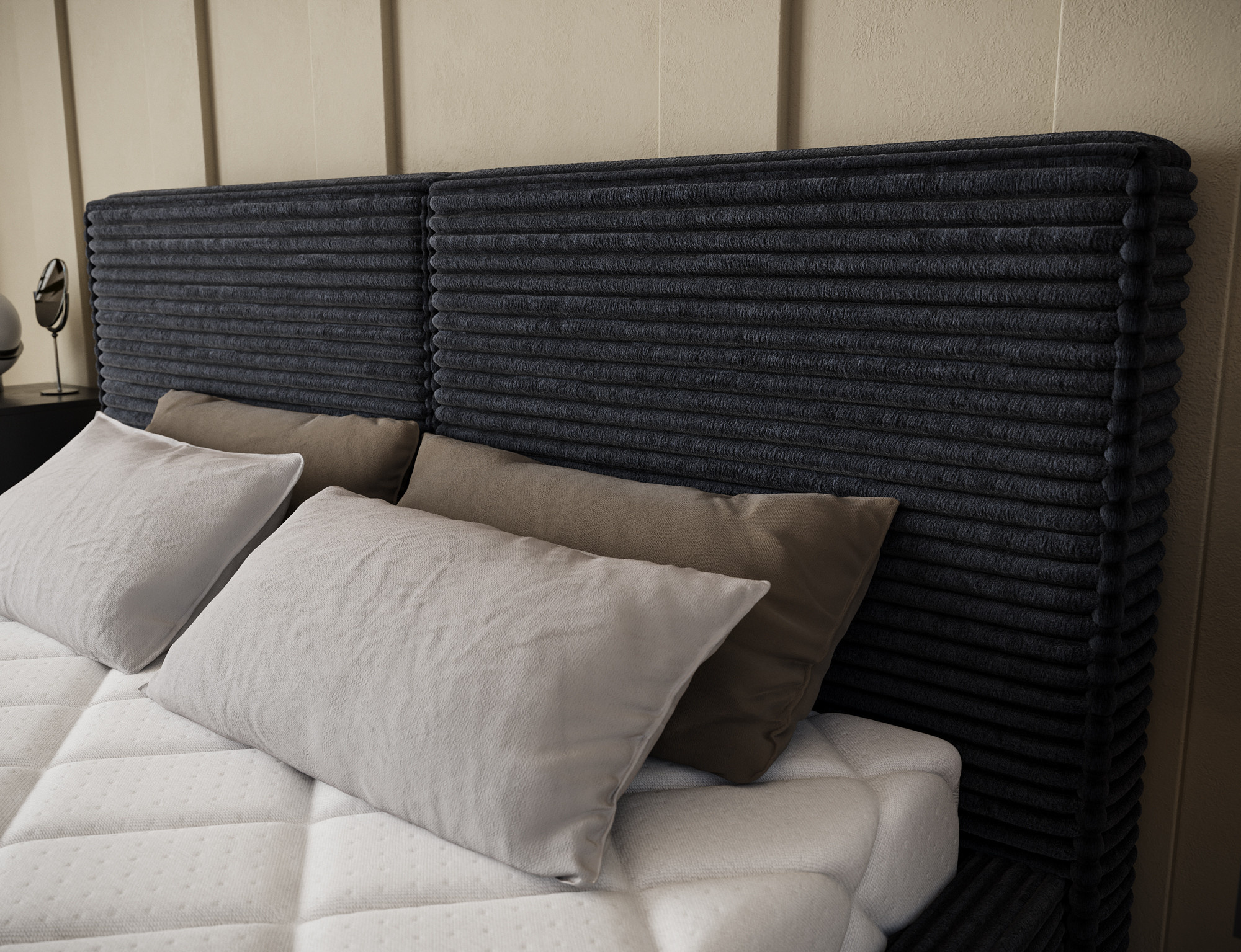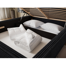 The Pesillo bedroom bed combines elegance and functionality in a modern design. The model is available in three size variants: 140x200 cm, 160x200 cm, and 180x200 cm, allowing you to perfectly match the bed to your bedroom’s dimensions and your individual needs. The total height of the bed is 103 cm, while its depth measures 220 cm. The width depends on the selected model and is 158 cm, 178 cm, or 198 cm respectively. The T2130 foam filling ensures comfort and durability, while the sturdy black plastic furniture legs provide stability and a refined finish. The Pesillo bed features a practical bedding container, allowing for efficient use of space and easy organization. Designed in a modern style, it perfectly fits current interior design trends, creating a cozy and elegant atmosphere ideal for relaxation.