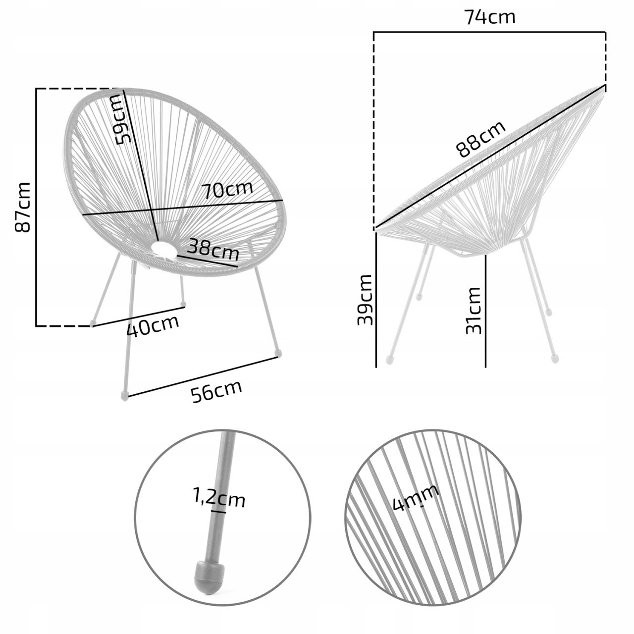 Méretek: - ülés szélessége: 70 cm - háttámla magassága: 59 cm - teljes magasság: 87 cm - ülés mélysége: 38 cm *részletes méretek az utolsó fényképen Anyag - ülés: technorattan - lábak: porfestett fém Szín: - ülés: fekete - lábak: fekete