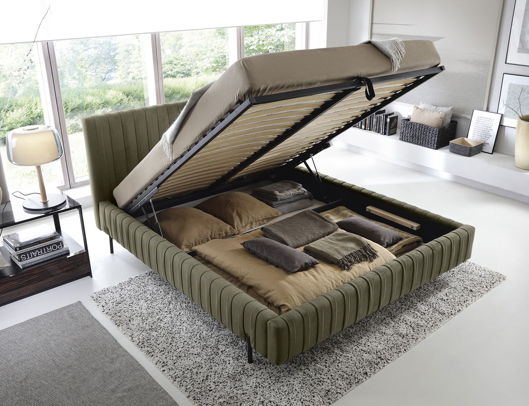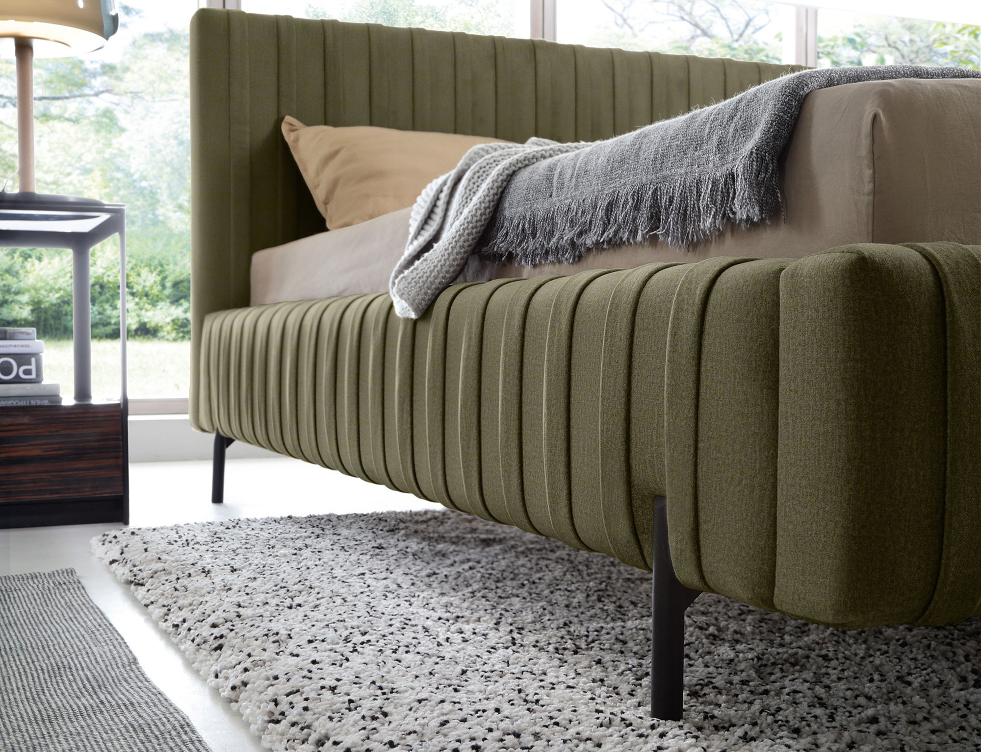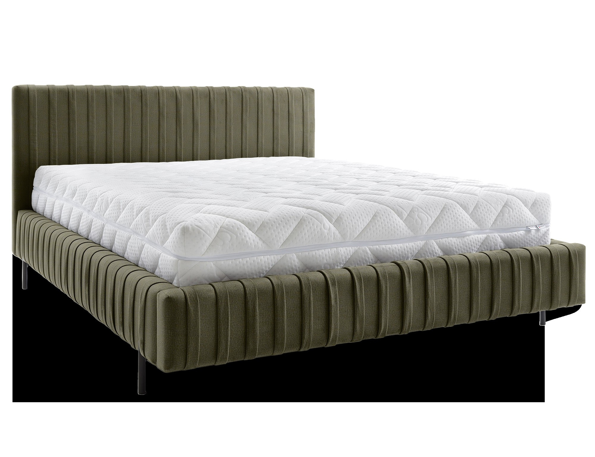 Plissa is a unique upholstered bed that delights with its modern design and functionality. It has a sturdy metal frame under the mattress and metal legs that provide stability and durability. The bed is sold without a mattress. Its practical bedding container allows for convenient storage of bedding and other items, making it an ideal solution for those who value functionality in their bedroom. Plissa is not only a bed but also a stylish decorative element that adds elegance to any interior.
