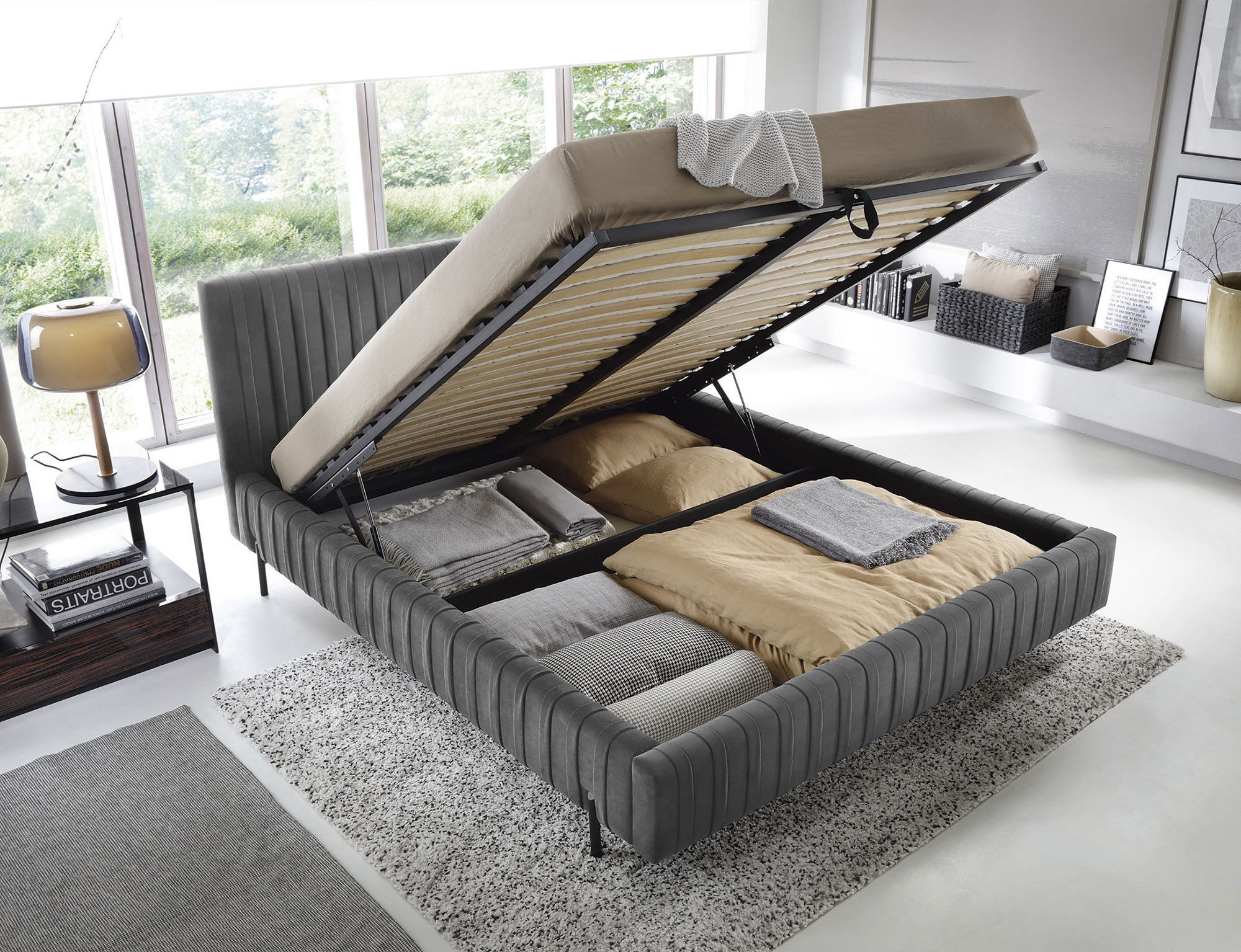Plissa is a unique upholstered bed that delights with its modern design and functionality. It has a sturdy metal frame under the mattress and metal legs that provide stability and durability. The bed is sold without a mattress. Its practical bedding container allows for convenient storage of bedding and other items, making it an ideal solution for those who value functionality in their bedroom. Plissa is not only a bed but also a stylish decorative element that adds elegance to any interior.