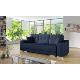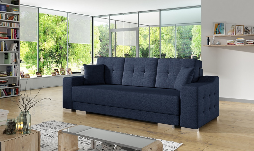 Modernistická pohovka CYPIS je masivní třímístná pohovka, která bude atraktivním a zároveň praktickým kusem nábytku do obývacího pokoje nebo obývacího pokoje. Stylová pohovka s bočnicemi je kus nábytku s funkcí spaní, který zaručuje pohodlný a bezpečný spánek. Tento kus nábytku, dokončený ve skandinávském dekoru, osloví i ty nejnáročnější uživatele - vypadá esteticky a zároveň poskytuje pohodlí a komfort i při dlouhém sezení. Rozkládací pohovka CYPIS je vybavena prostorným úložným prostorem na lůžkoviny a automatickým rozkládáním, díky níž je přeměna pohovky na lůžko rychlá a efektivní. Model CYPIS stojí na masivním dřevěném rámu a celou konstrukci podpírají chromované nohy, které nábytku dodávají moderní charakter. Výplň pohovky tvoří vlnité pružiny, které udržují odpovídající pružnost sedáku a opěráku. Součástí sady s pohovkou jsou dva dekorační polštáře. Volně stojící pohovka CYPIS potěší prošívanými boky i prošíváním viditelným na tvarovaném opěradle. Pohovka do obývacího pokoje může být čalouněná látkou nebo ekokůží v široké škále barev, ze kterých si můžete vybrat.