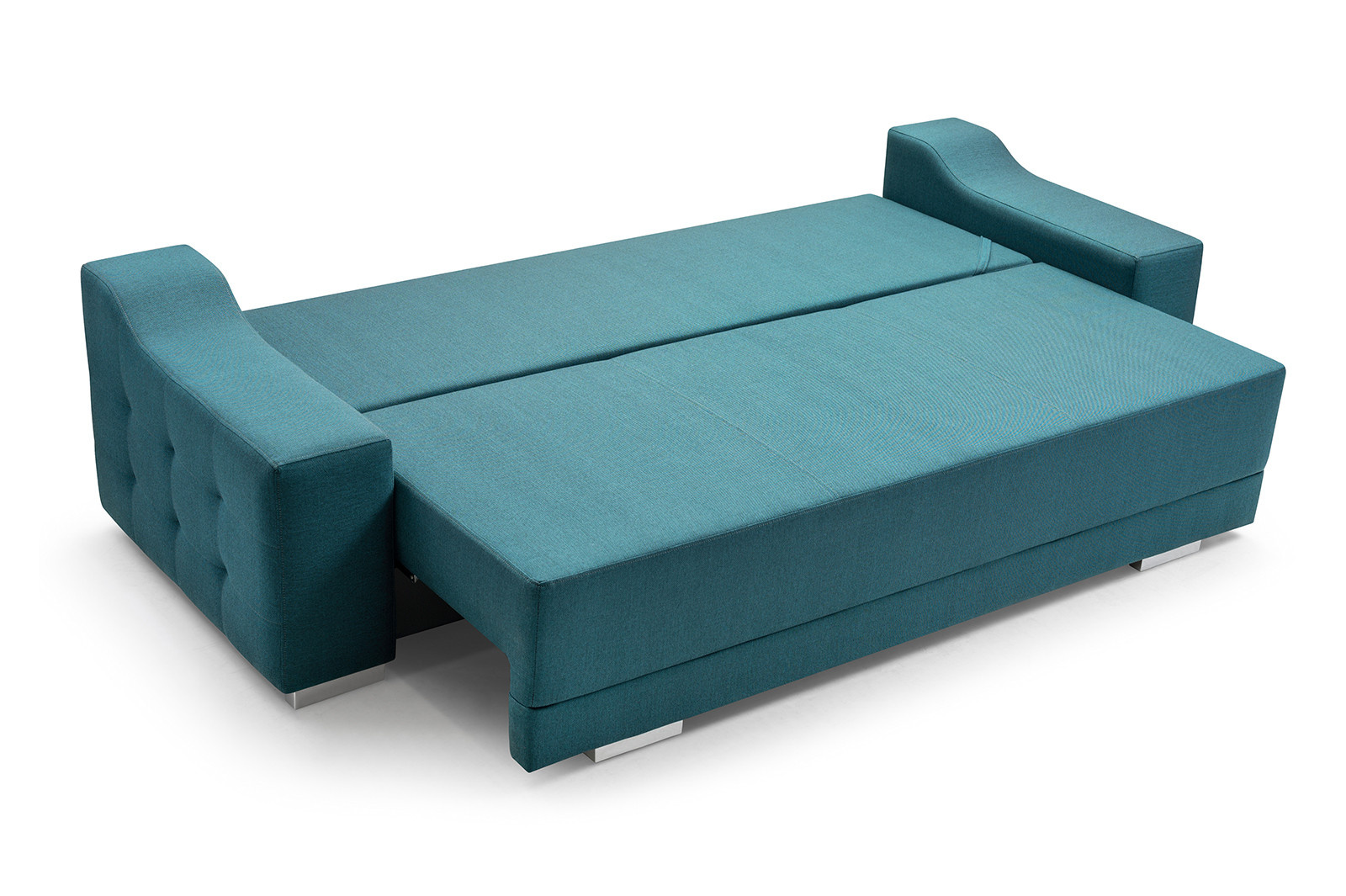 Modernistická pohovka CYPIS je masivní třímístná pohovka, která bude atraktivním a zároveň praktickým kusem nábytku do obývacího pokoje nebo obývacího pokoje. Stylová pohovka s bočnicemi je kus nábytku s funkcí spaní, který zaručuje pohodlný a bezpečný spánek. Tento kus nábytku, dokončený ve skandinávském dekoru, osloví i ty nejnáročnější uživatele - vypadá esteticky a zároveň poskytuje pohodlí a komfort i při dlouhém sezení. Rozkládací pohovka CYPIS je vybavena prostorným úložným prostorem na lůžkoviny a automatickým rozkládáním, díky níž je přeměna pohovky na lůžko rychlá a efektivní. Model CYPIS stojí na masivním dřevěném rámu a celou konstrukci podpírají chromované nohy, které nábytku dodávají moderní charakter. Výplň pohovky tvoří vlnité pružiny, které udržují odpovídající pružnost sedáku a opěráku. Součástí sady s pohovkou jsou dva dekorační polštáře. Volně stojící pohovka CYPIS potěší prošívanými boky i prošíváním viditelným na tvarovaném opěradle. Pohovka do obývacího pokoje může být čalouněná látkou nebo ekokůží v široké škále barev, ze kterých si můžete vybrat.