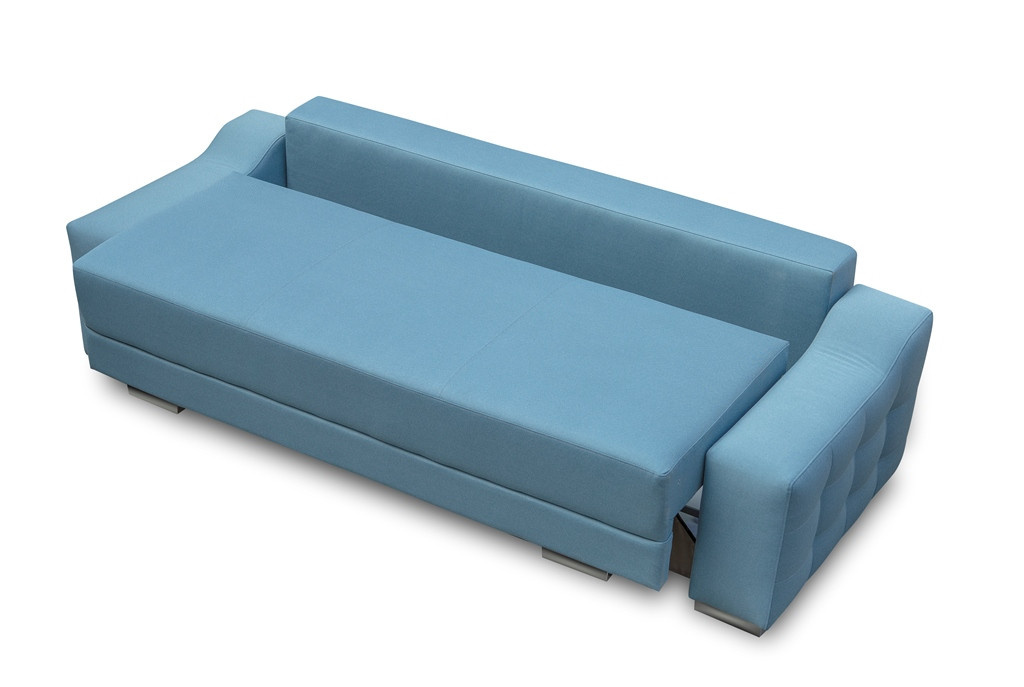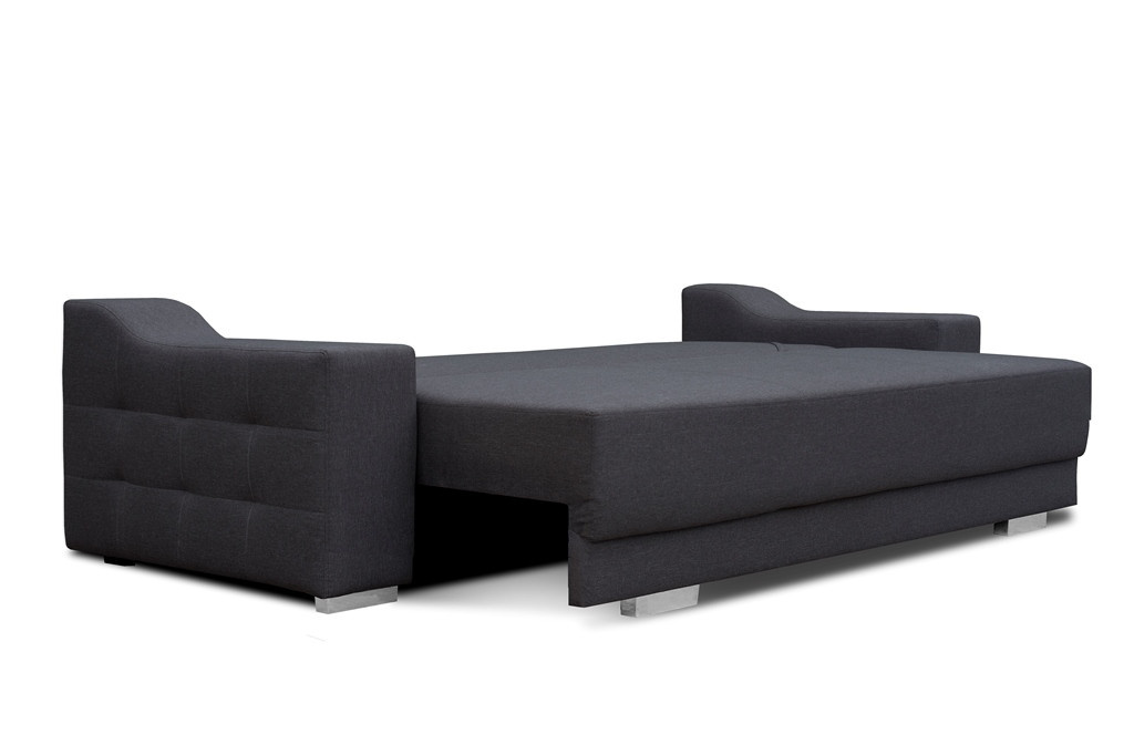 Modernistická pohovka CYPIS je masivní třímístná pohovka, která bude atraktivním a zároveň praktickým kusem nábytku do obývacího pokoje nebo obývacího pokoje. Stylová pohovka s bočnicemi je kus nábytku s funkcí spaní, který zaručuje pohodlný a bezpečný spánek. Tento kus nábytku, dokončený ve skandinávském dekoru, osloví i ty nejnáročnější uživatele - vypadá esteticky a zároveň poskytuje pohodlí a komfort i při dlouhém sezení. Rozkládací pohovka CYPIS je vybavena prostorným úložným prostorem na lůžkoviny a automatickým rozkládáním, díky níž je přeměna pohovky na lůžko rychlá a efektivní. Model CYPIS stojí na masivním dřevěném rámu a celou konstrukci podpírají chromované nohy, které nábytku dodávají moderní charakter. Výplň pohovky tvoří vlnité pružiny, které udržují odpovídající pružnost sedáku a opěráku. Součástí sady s pohovkou jsou dva dekorační polštáře. Volně stojící pohovka CYPIS potěší prošívanými boky i prošíváním viditelným na tvarovaném opěradle. Pohovka do obývacího pokoje může být čalouněná látkou nebo ekokůží v široké škále barev, ze kterých si můžete vybrat.