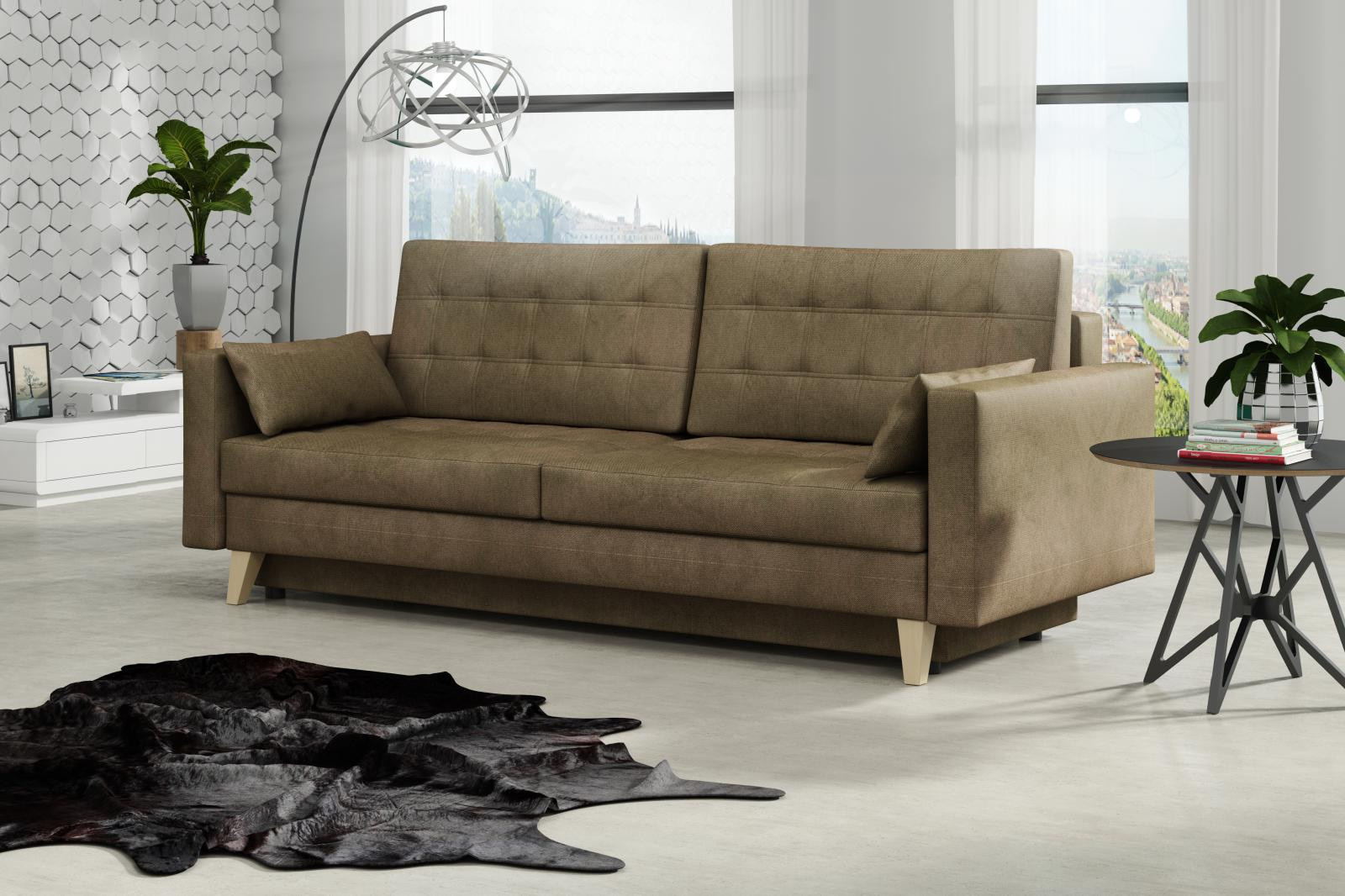 Pohovka Kelly je krásná a elegantní pohovka, která výborně zapadne do každého interiéru. Pohovka je velmi pohodlná a praktická. Praktickou stránkou pohovky je možnost rozložení - jednoduchým rozložením pomocí automatu vznikne dostatečně prostorné lůžko občasnému přespání Vaší návštěvy a samozřejmostí je také nepostradatelný úložný prostor. Pohodlí při sezení zajišťuje výpň sedáku z vlnitých pružin v kombinaci s pružinami bonell a kvalitní PUR pěnou. Pohovka je celočalouněná, takže ji můžete umístit i do prostoru. Výborně se hodí do obývacího pokoje, do pracovny či pokoje pro hosty. Pohovku nabízíme v několika trendy barvách. Vyobrazené dopňky a dekorace nejsou v ceně. Zobrazení barev produktu na fotograii se může nepatrně lišit od skutečnosti.