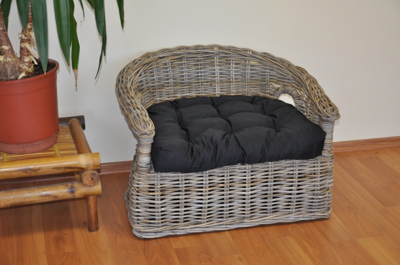 Pohovka pro vašeho pejska ručně pletená z ratanu kubu v přírodní šedé barvě. Ratan kubu se vyznačuje vysokou pevností a odolností. Pohovku dodáváme včetně měkkého polštáře. | Velikost pohovky je 70x57x48 cm Výška sedu je 30 cm. Velikost polštáře v černé barvě potahové látky je 54x47 cm. Vzhledem k tomu, že pohovka je vyrobena ze stejně masivního ratanu jako sedací soupravy pro dospělé lidi, tak se nemusíte obávat, že by tato pohovka vašeho miláčka neunesla.