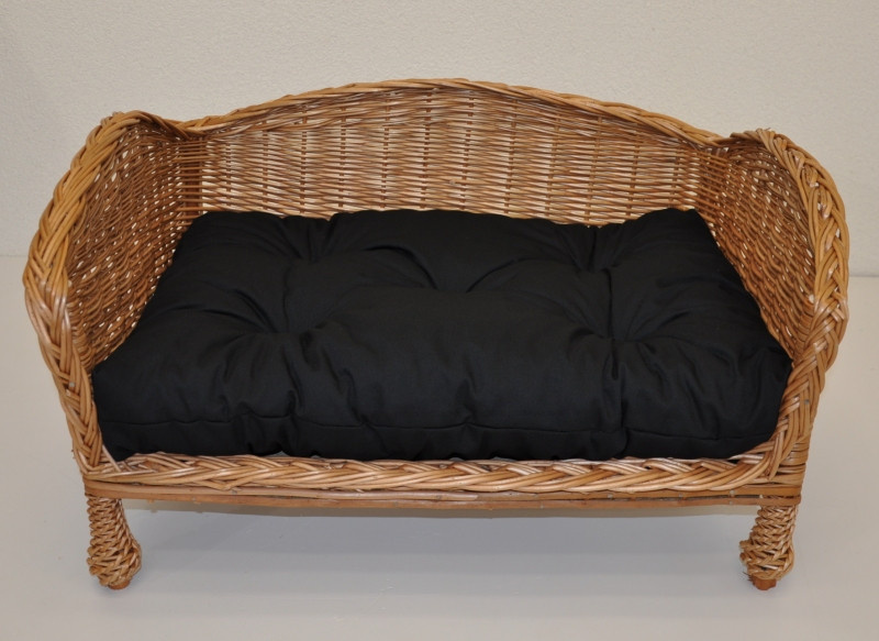 Pohovka pro psa vyrobená z vrbového proutí. | Pohovka je vyrobena z přírodního vrbového proutí. Konstrukce pohovky je vyrobena ze silných vrbových tyčí. Součástí je měkký polstr v černé barvě potahové látky. Velikost pohovky je 68x47x36 cm. Výška sedu je 22 cm. Velikost vnitřního polštáře je 60x40 cm.