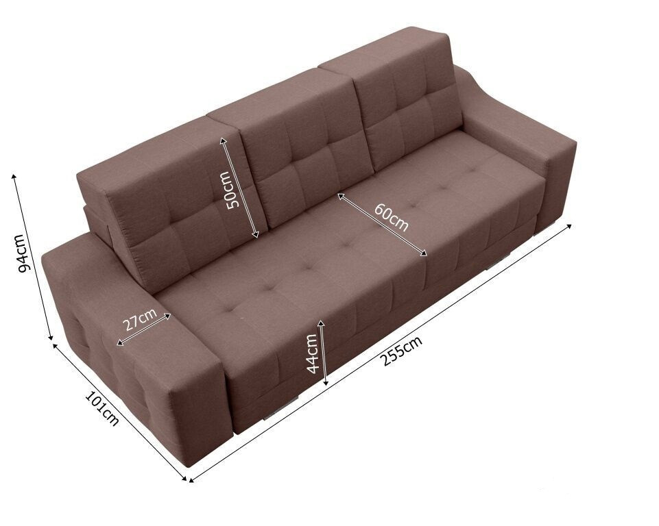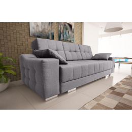 Pohovka Týna je rozkládací a součástí je i praktický úložný prostor. Prošití a stříbrné nožky jí dodávají moderní a zároveň elegantní vzhled. Výplň pohovky tvoří vlnité pružiny faliste v kombinaci s kvalitní PUR pěnou. Rozkládání je díky automatu jednoduché a po rozložení vznikne lůžko vhodné k příležitostnému přespání. Pohovku dodáváme v několika barevných provedeních, které také naleznete v naší nabídce. Rozpis rozměrů najdete na přiloženém obrázku s nákresem. Součátí pohovky jsou 3 opětné polštáře a 2 malé dekorační polštářky. Ostatní vyobrazené dekorace nejsou v ceně.