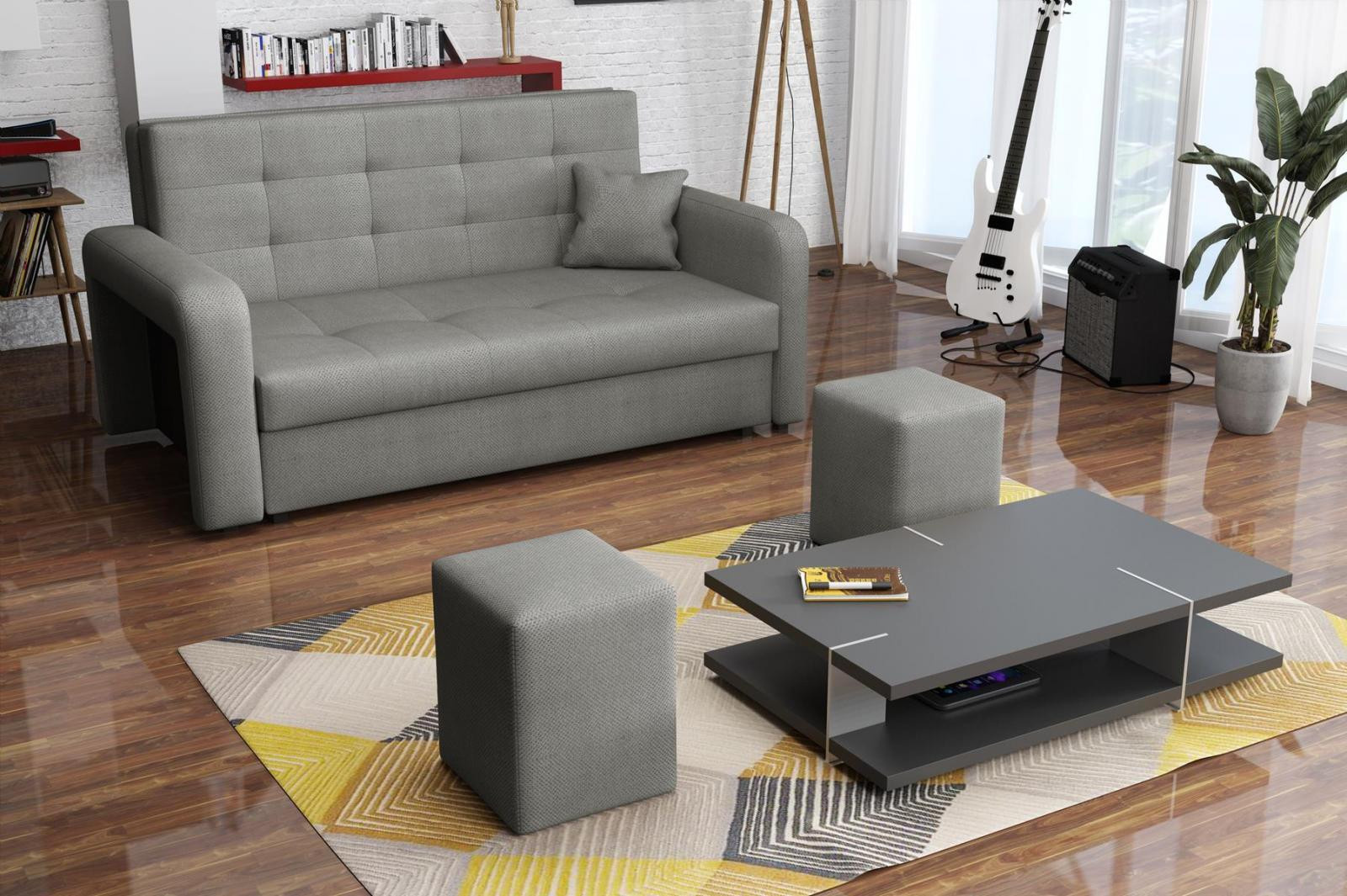 Rozkládací pohovka Vivian je díky svým rozměrům vhodná i do menších pokojů. Své uplatnění najde nejen v obývacím pokoji, ale také v dětském, studentském, nebo hostinském pokoji. Jednoduchým rozložením pomocí automatu, získáte lůžko k příležitostnému přespání Vaší návštěvy. Výplň sedáku tvoří vlnité pružiny v kombinaci s PUR pěnou. Pohovka je potažena kvalitní látkou a nabízíme ji v několika trendy odstínech. Pohovka disponuje i nepostradatelným úložným prostorem, který využijete např. na deku a polštář. V ceně pohovky je 1 dekorační polštář a 2 taburety, které jsou důmyslně uložené v područi pohovky. Taburety můžety využít k sezení, nebo k podepření nohou při odpočinku. Ostatní vyobrazené dekorace nejsou v ceně. Vlivem nastavení monitorů, nebo displejů telefonů, se zobrazení barev na fotograii může od skutečnosti lišit. Vyobrazené dopňky a dekorace nejsou v ceně.