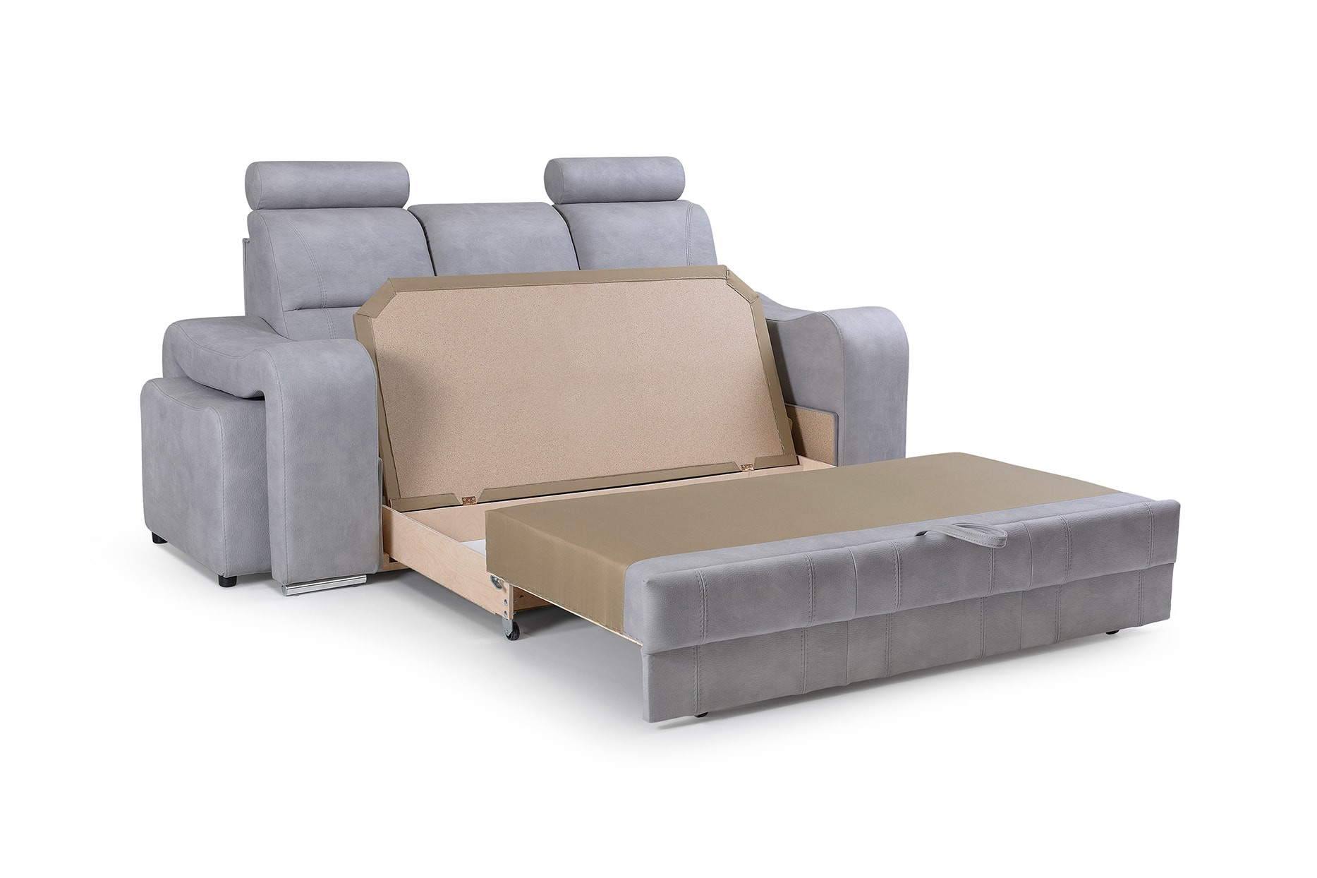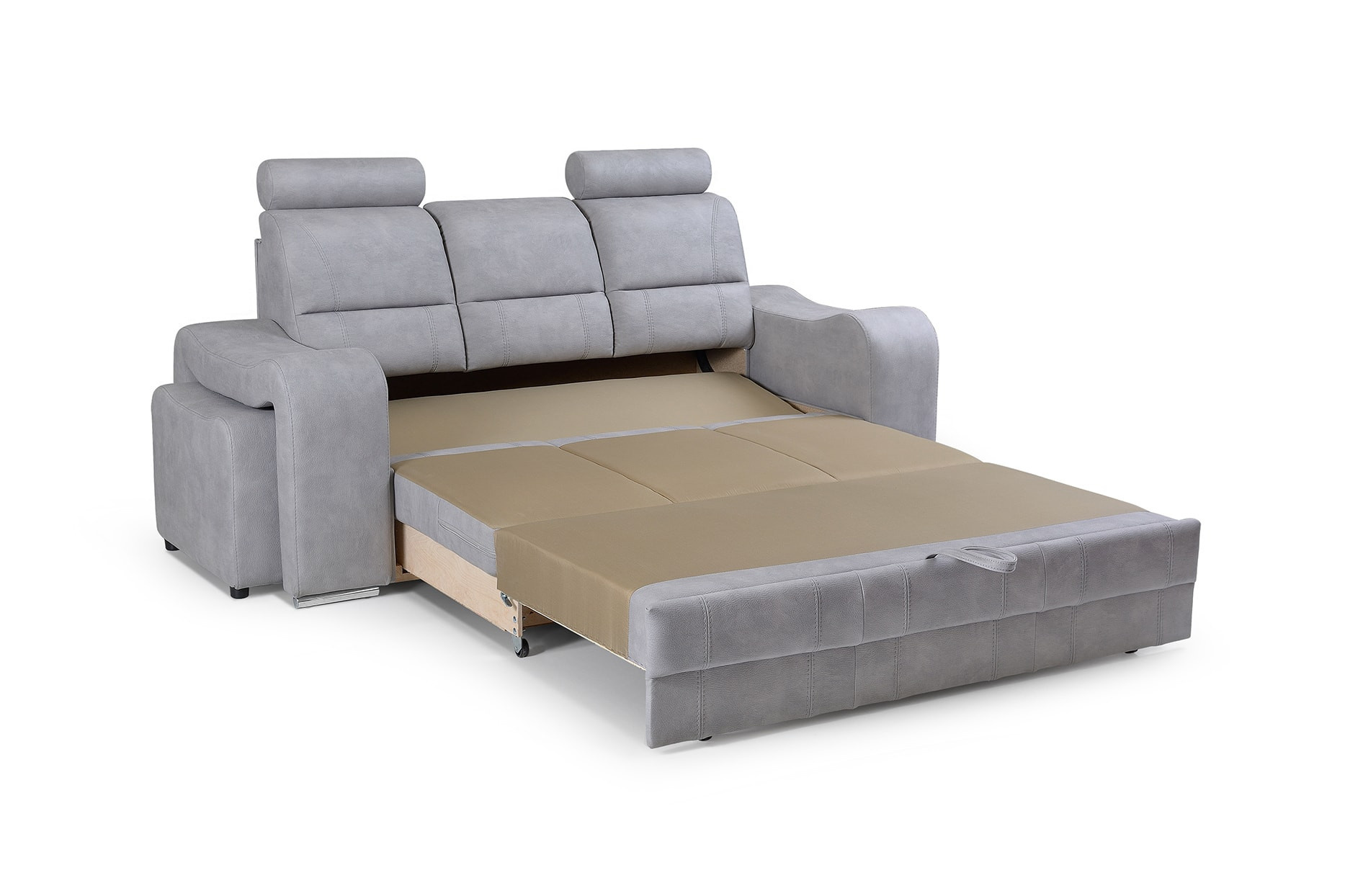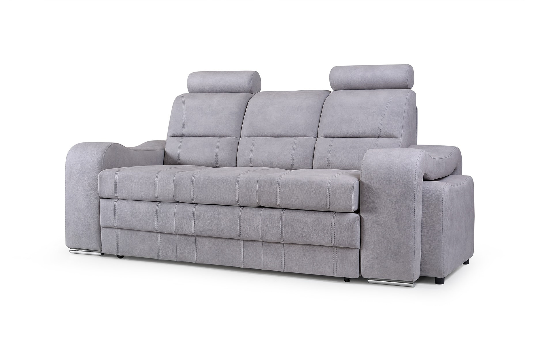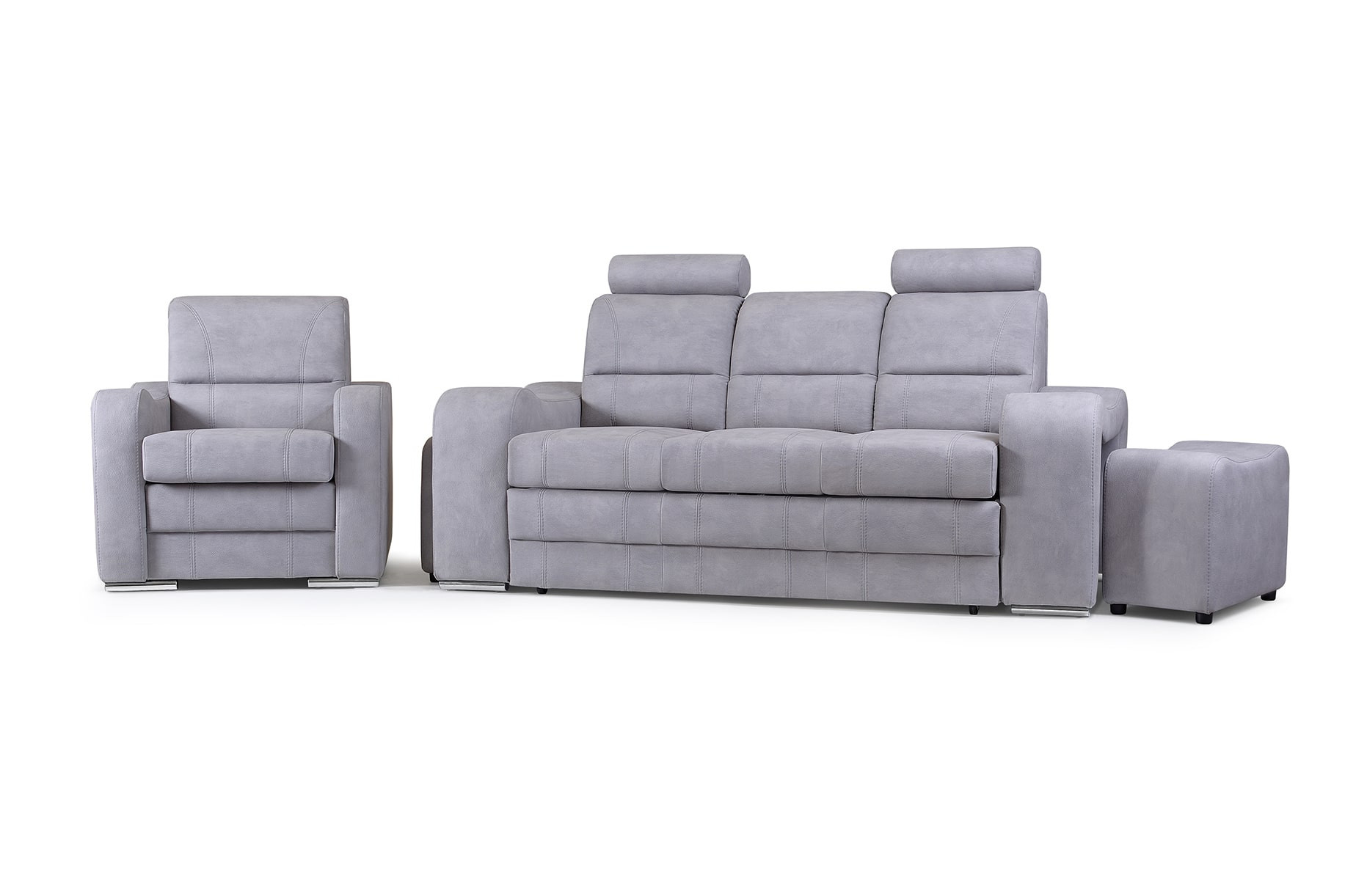 WENUS je masivní pohovka s originálním designem, která se skvěle hodí do moderně zařízeného obývacího pokoje pro volný čas. Tvarovaná pohovka stojí na nízkých chromovaných nožkách, které nábytku dodávají moderní nádech. Boční rozkládací pohovka je vybavena funkcí automatického asistovaného rozkládání, díky které můžete pohovku rychle a efektivně proměnit v pohodlné a bezpečné lůžko. Pohovka WENUS s funkcí spaní má zabudovaný úložný prostor na taburety - souprava obsahuje dva taburety, které lze použít jako další sedadlo, a praktické podnožky při odpočinku. Pohovka s bočnicemi je navíc vybavena prostorným úložným prostorem na lůžkoviny, do kterého lze snadno uložit přikrývky, polštáře a další předměty denní potřeby. Představený model se vyrábí na speciální objednávku, takže si můžete vybrat z široké škály barev látek, díky nimž můžete nábytek dokonale sladit s uspořádanou místností. Moderní kus nábytku je vyplněn HR pěnou na opěradle a pěnou T-30 na sedáku, což zajistí pohodlí a komfort i při mnohahodinovém sezení. Pohovka WENUS je volně stojící kus nábytku, a proto je čalouněná i zadní část pohovky - lze ji umístit nejen ke stěně, ale i do centrální části místnosti.