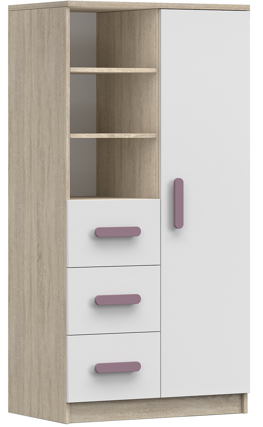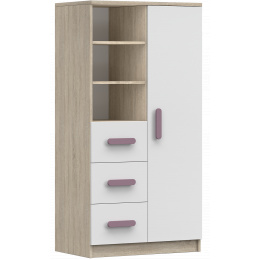 A SMYK III modern bútorcsalád egyszerűségével és eleganciájával örvendeztet meg, amely a korpusz Sonoma Tölgy színét és a fehér frontokat kombinálja. A "Smyk III" másik megkülönböztető eleme a díszes fa fogantyúk, amelyek különböző színekben kaphatók. Éppen ezek adják a bútornak a karakterét, és teremtenek egyedi és finom légkört a gyerekszobában.