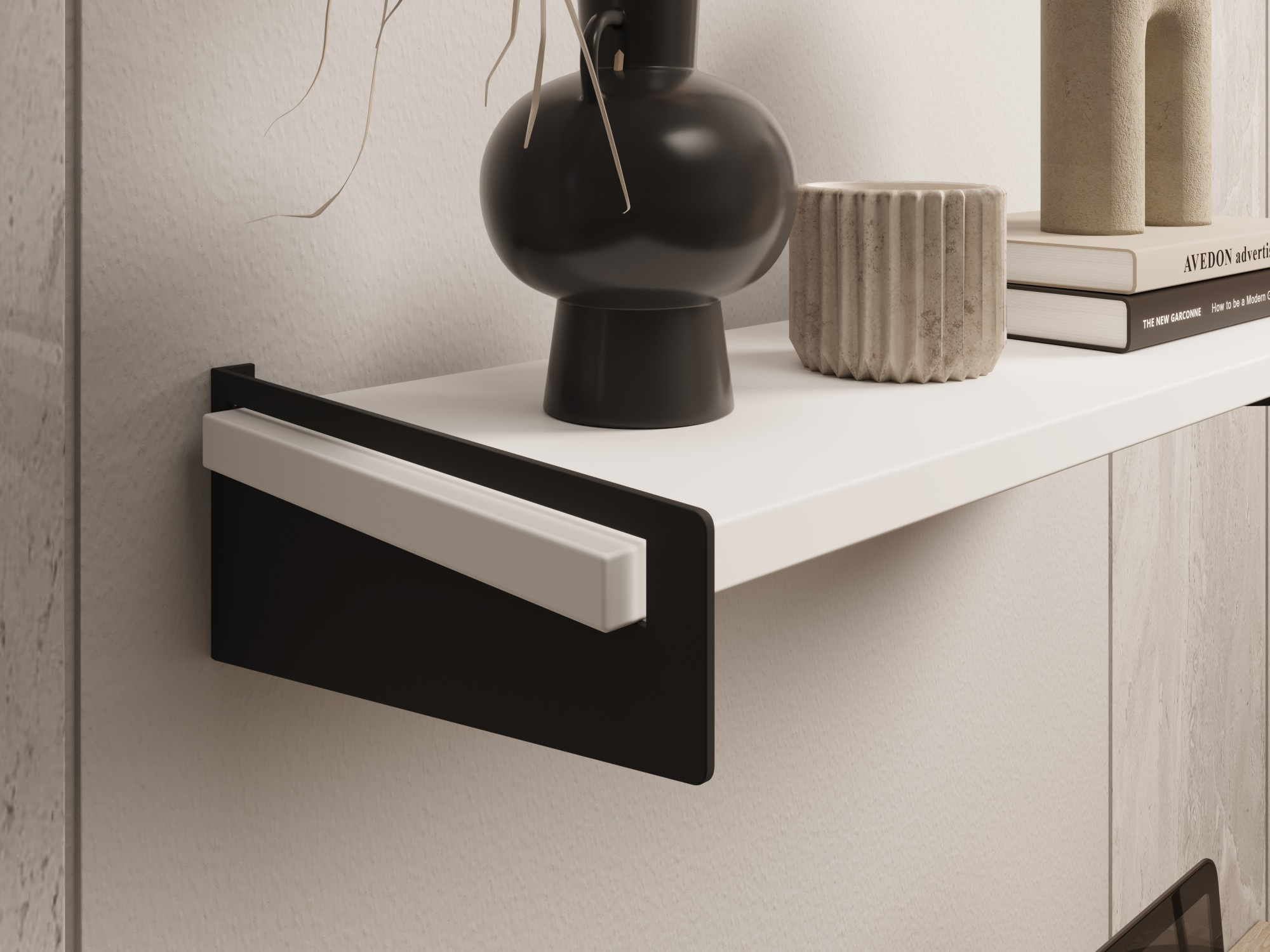 A Polička Ovo egy modern és stílusos kiegészítő a belső terekhez, amelyet eredeti dizájn és magas színvonalú kidolgozás jellemez. A polc jellegzetes, lekerekített formája harmóniát és finomságot visz a térbe, egyedi stílust kölcsönözve neki. Ez a modell a minimalista dizájn szerelmeseinek készült, akik értékelik az esztétikát a funkcionalitással összekapcsolva. A fém oldalsó fogantyúk nemcsak stabilitást kölcsönöznek az Ovo polcnak, hanem kifinomult jelleget is. Az Ovo polc a fogantyúk gazdag színpalettájának köszönhetően – a klasszikus árnyalatoktól, mint a fekete vagy fehér, egészen a feltűnőbb színekig, mint a mélyzöld, tengerészkék, vagy a divatos, fémes felületek – dekoratív elemmé válik, amely könnyen alkalmazkodik a különböző belső tér elrendezésekhez. A polc nagyszerűen mutat mind a lakóterekben, mint például a nappaliban, hálószobában vagy előszobában, mind pedig a modern irodákban vagy dolgozószobákban. Az Ovo polc fém fogantyúkkal azok számára készült, akik elegáns és egyben funkcionális megoldást keresnek tárgyak tárolására és kiállítására.