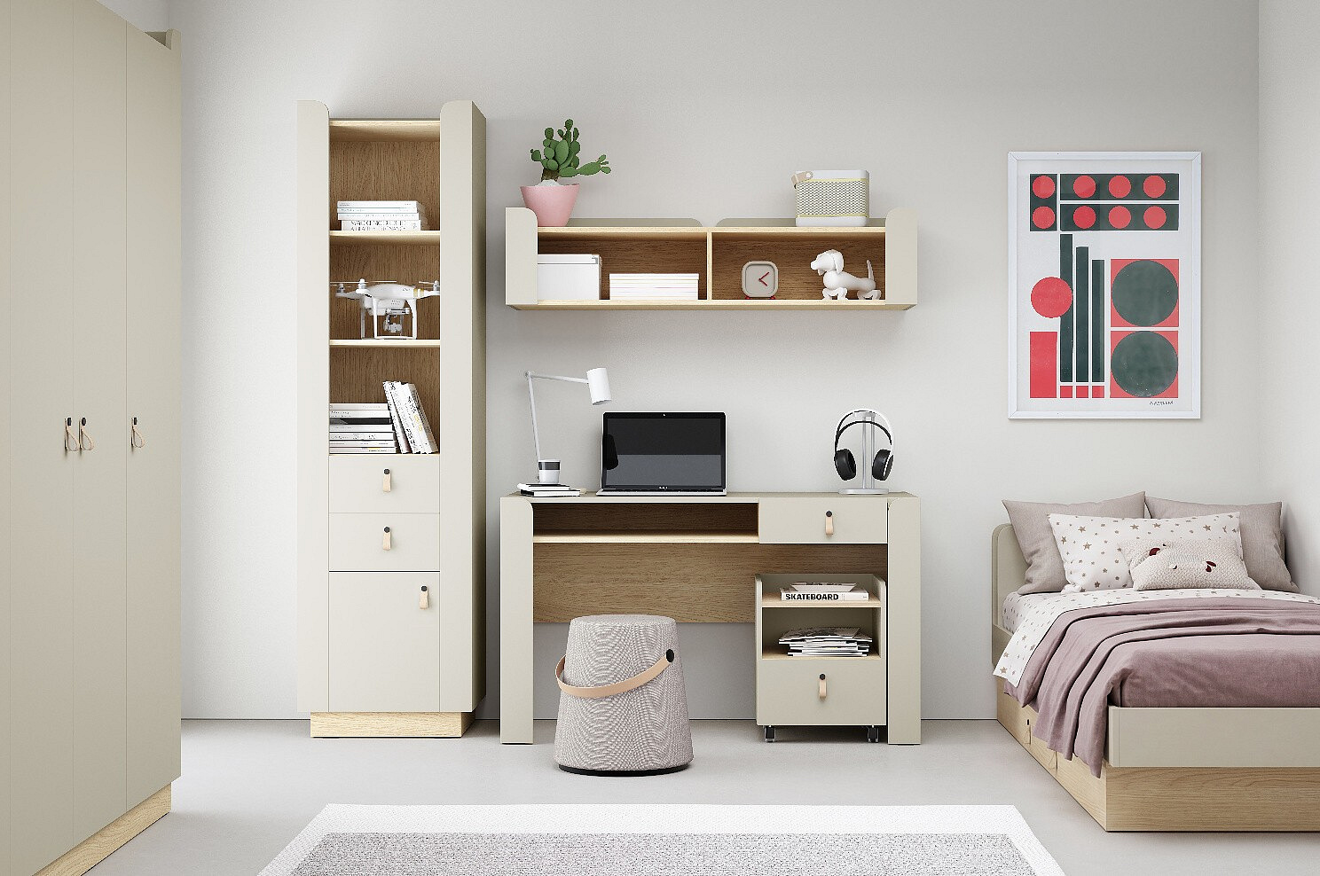 A SALERNO moduláris rendszer két színváltozatban érhető el: Macadamia/Tölgy Mavelie és Porcini/Tölgy Mavelie. Ez a rendszer lehetővé teszi a könnyű kombinálást és harmonikus belső tér kialakítását, legyen szó akár gyerekszobáról, nappaliról vagy otthona bármely más helyiségéről.