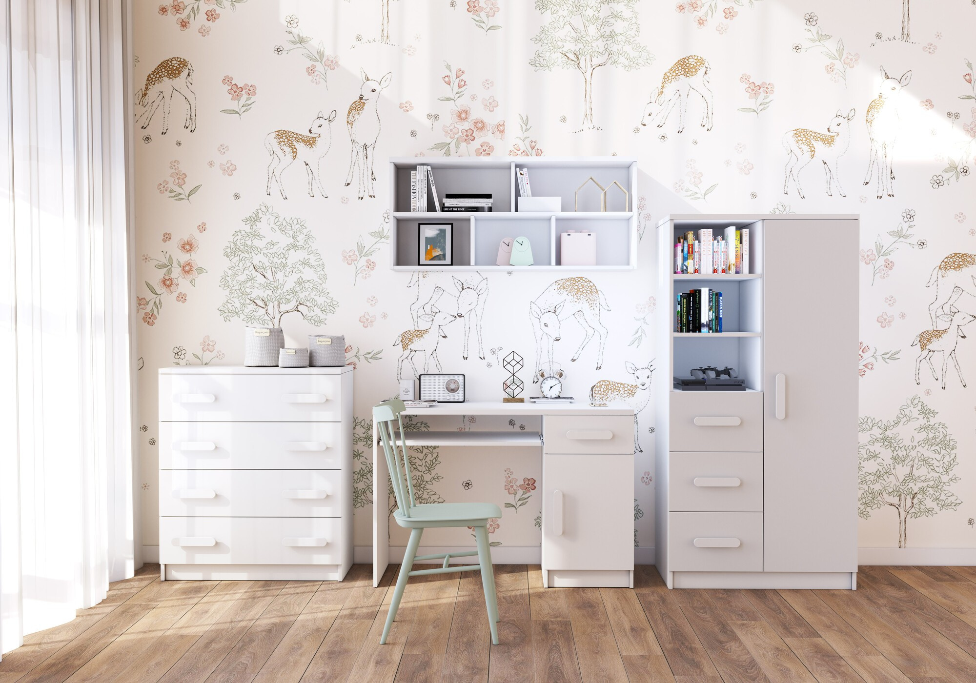 A SMYK I modern bútorcsalád egyszerűségével és eleganciájával örvendeztet meg, amely a korpusz és a frontok klasszikus fehér színét ötvözi. A "Smyk I" másik jellemzője a díszes fa fogantyúk, amelyek különböző színekben kaphatók. Éppen ezek adják a bútornak a karakterét, és teremtenek egyedi és finom légkört a gyerekszobában.