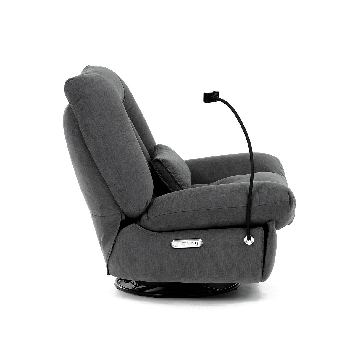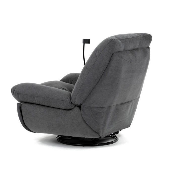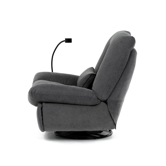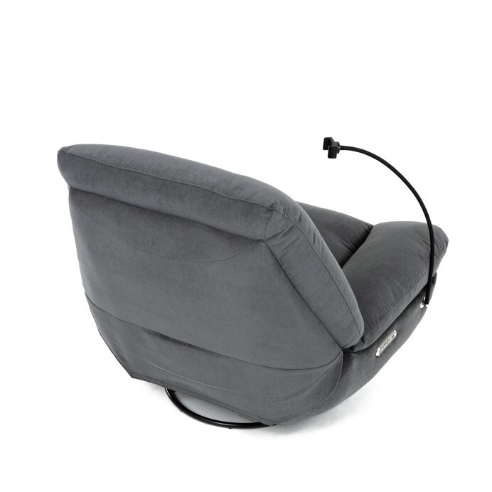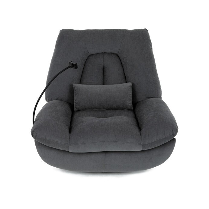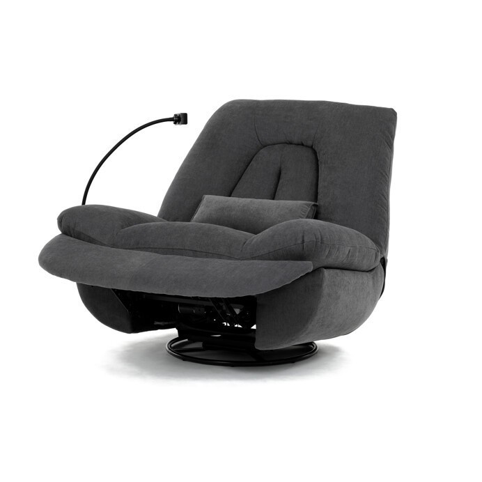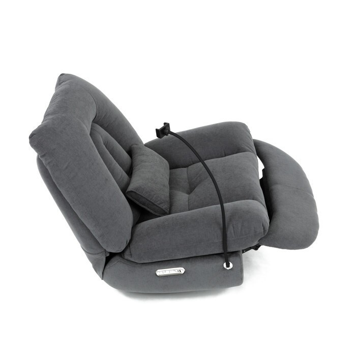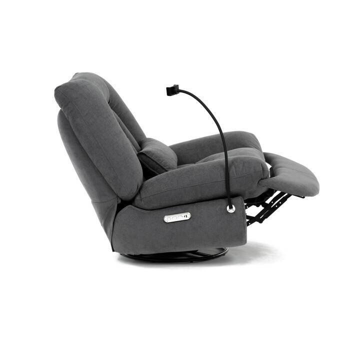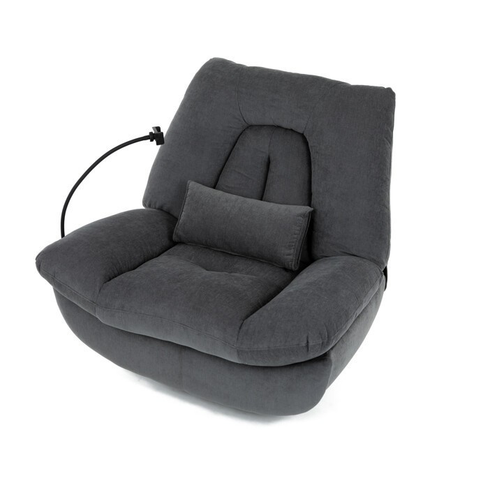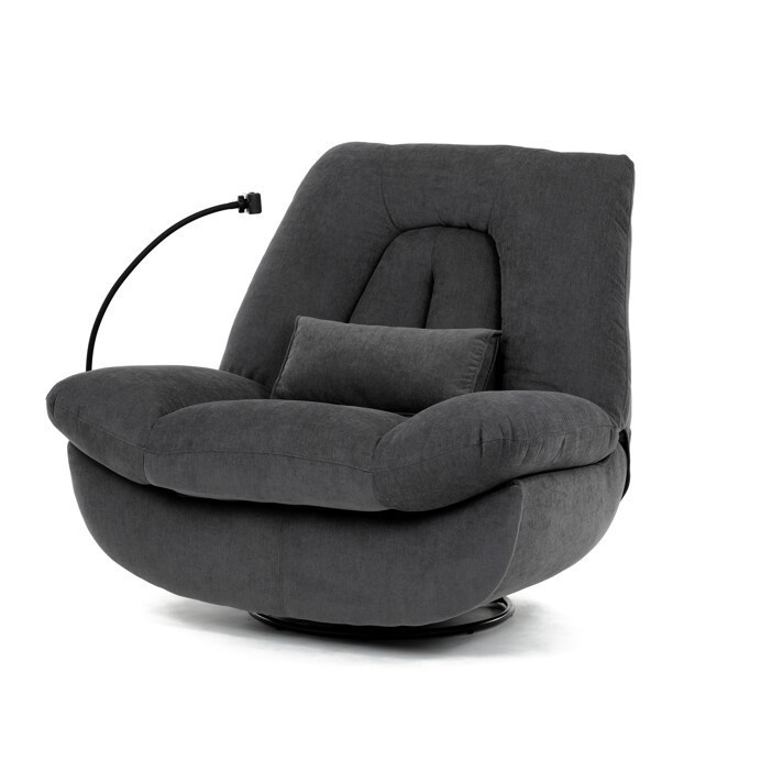 Polohovací elektrické křeslo v šedé látce nabízí komfortní sezení s možností nastavení polohy díky dvěma samostatným motorům. Robustní kovová základna umožňuje rotaci až do 240° a zároveň funkci houpání s úhlem 30°, což přispívá k relaxaci a variabilitě užívání. Zabudované ovládání je intuitivní a doplněné o USB-A a USB-C porty pro snadné nabíjení elektronických zařízení. Praktický úložný box integrovaný v křesle poskytuje prostor pro drobnosti, zatímco držák telefonu zvyšuje uživatelský komfort. Polstrované područky a ergonomicky tvarované opěradlo s přidaným polštářkem podporují správné držení těla, přičemž nosnost křesla je 160 kg.