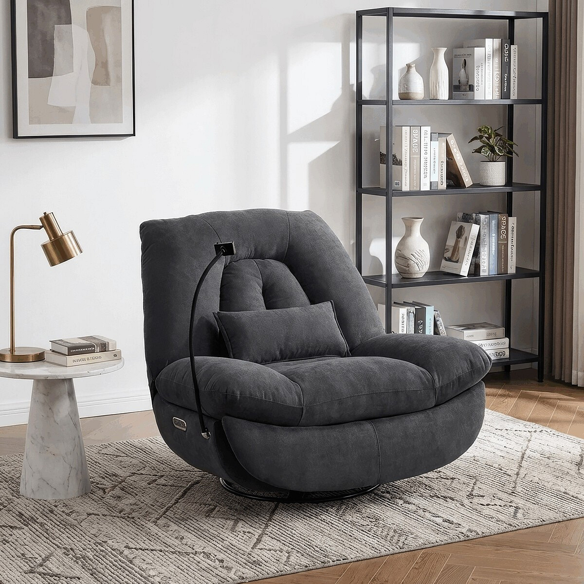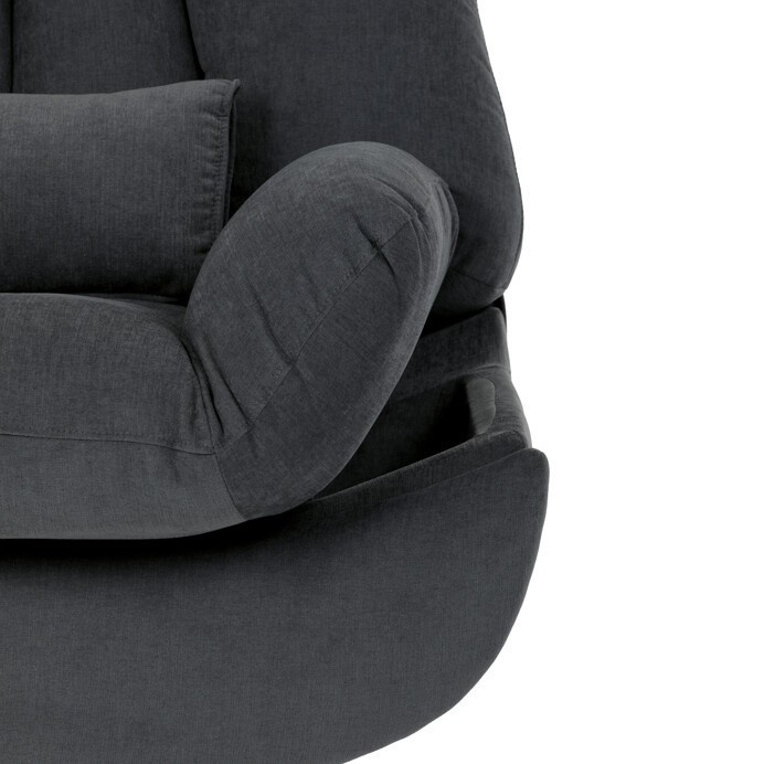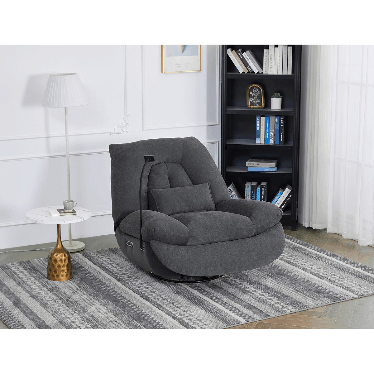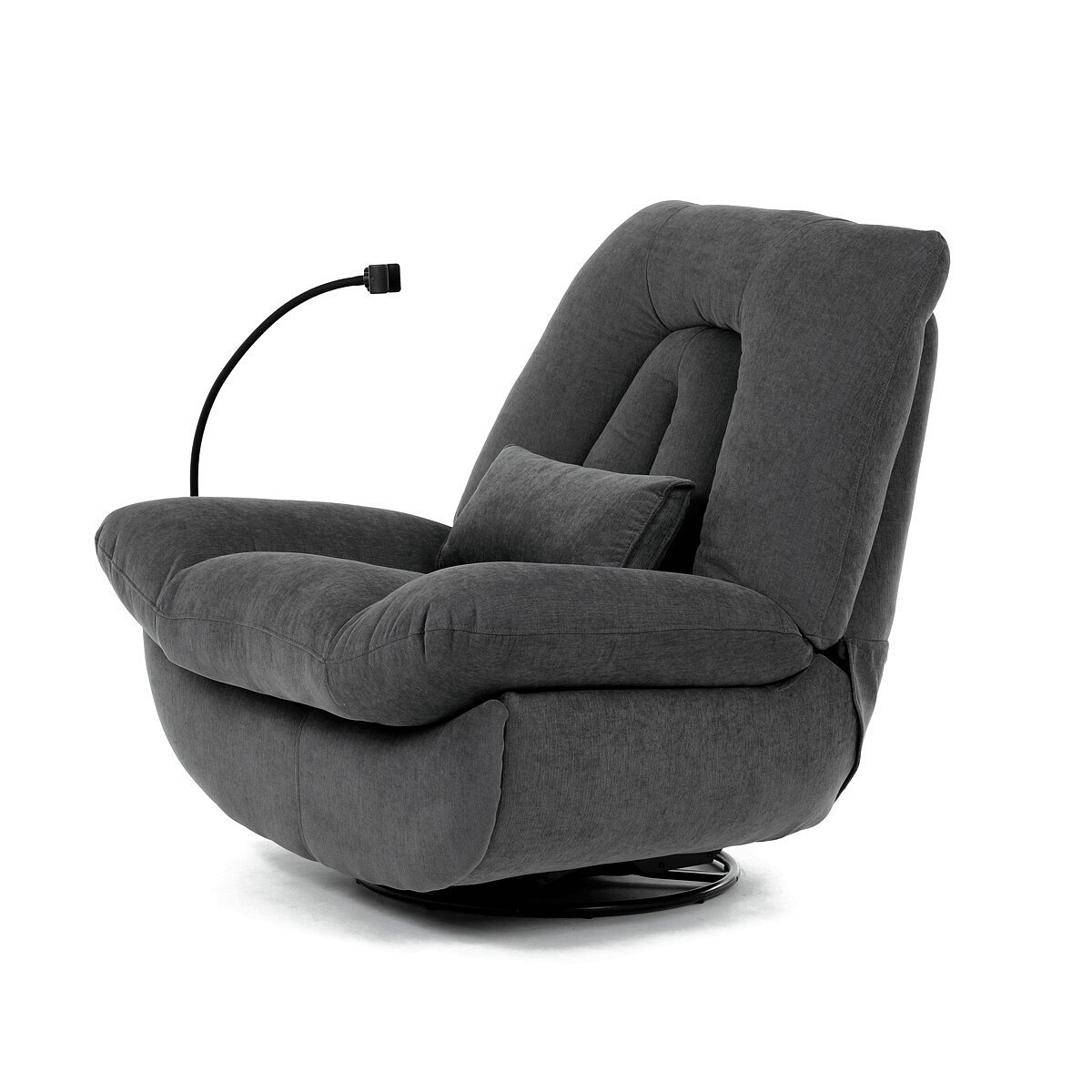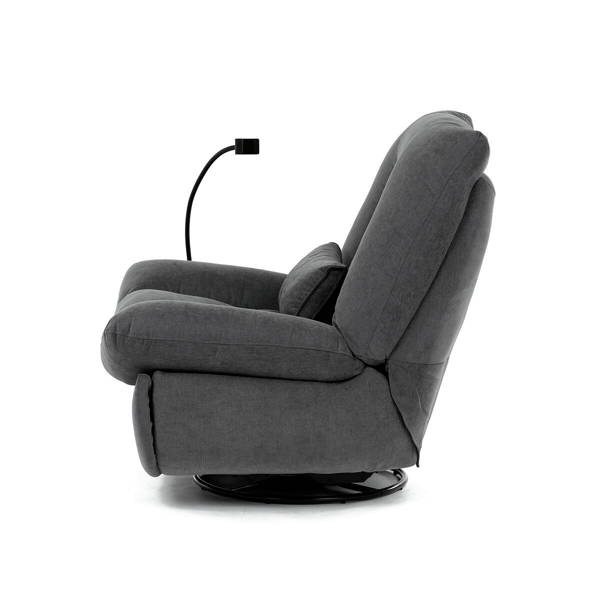 Polohovací elektrické křeslo v šedé látce nabízí komfortní sezení s možností nastavení polohy díky dvěma samostatným motorům. Robustní kovová základna umožňuje rotaci až do 240° a zároveň funkci houpání s úhlem 30°, což přispívá k relaxaci a variabilitě užívání. Zabudované ovládání je intuitivní a doplněné o USB-A a USB-C porty pro snadné nabíjení elektronických zařízení. Praktický úložný box integrovaný v křesle poskytuje prostor pro drobnosti, zatímco držák telefonu zvyšuje uživatelský komfort. Polstrované područky a ergonomicky tvarované opěradlo s přidaným polštářkem podporují správné držení těla, přičemž nosnost křesla je 160 kg.