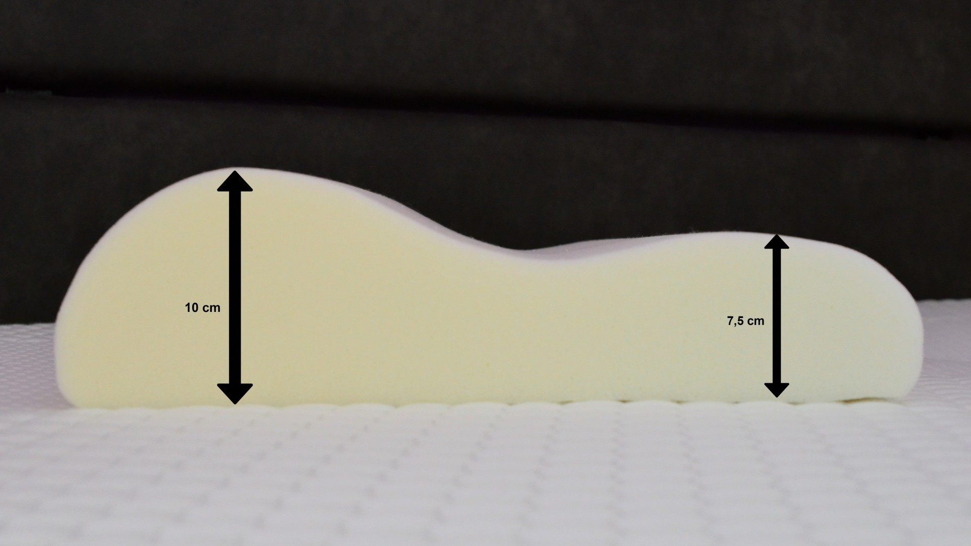 Nejvyšší výška polštáře je 10 cm, z druhé strany 7,5 cm. Polštář lze otočit a použít z obou stran, podle toho, která z výšek Vám bude více vyhovovat.