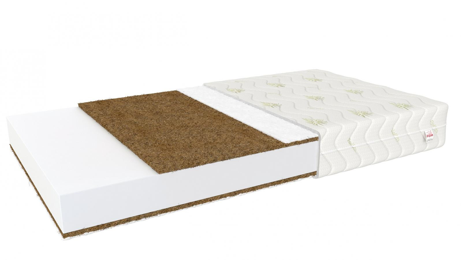 kokosová vložka: 1 cm, polyuretanová pěna T25: 7 cm, kokosová vložka: 1 cm.