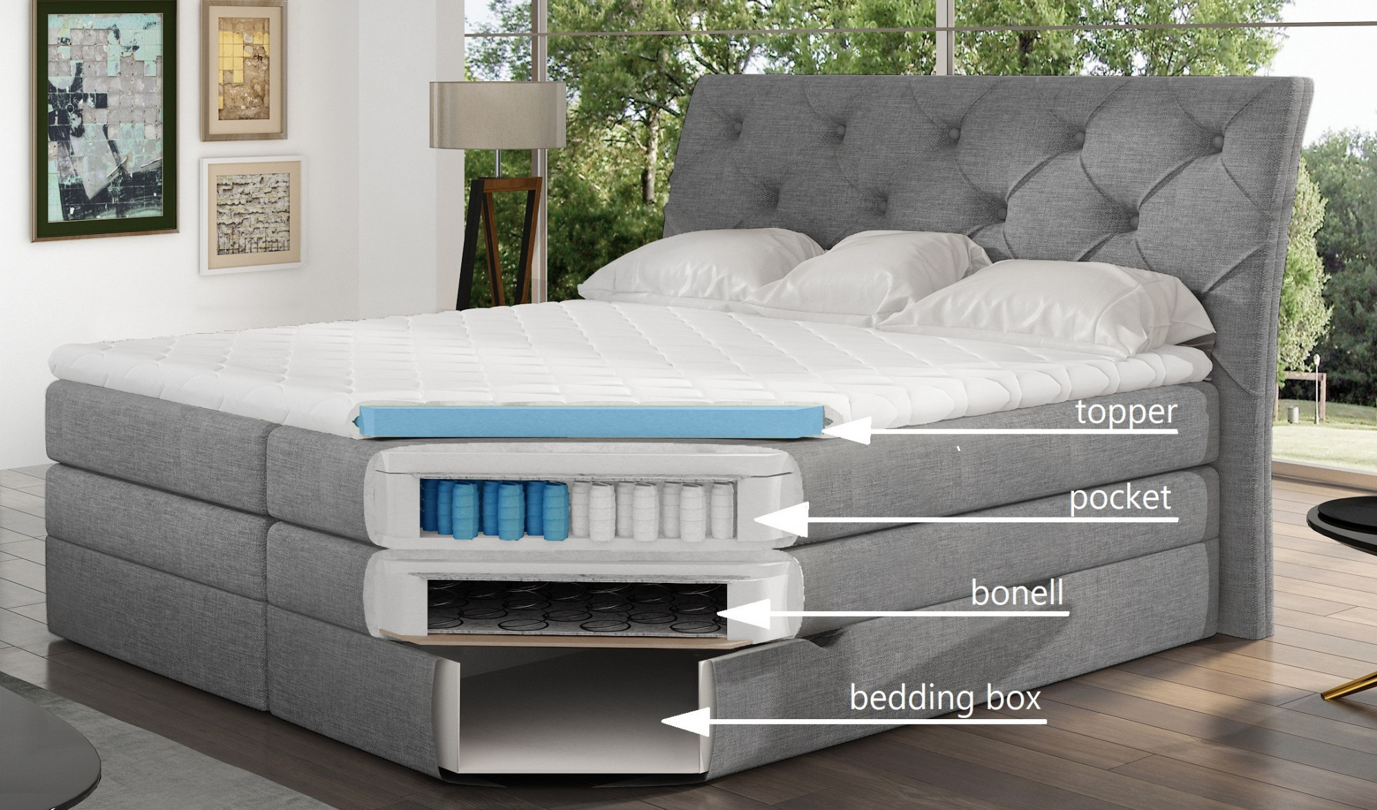 Postel se skládá z několika různých vrstev, kdy každá plní určitou funkci. Nejdůležitější částí postele je spodní rám, který tvoří dřevěný dělený box - úložný prostor postele. Na tomto dřevěném boxu je uložena kvalitní bonelová matrace. Na matraci je umístěna svrchní matrace neboli topper. Boxspring Miriam se vyrábí ve třech rozměrech.
