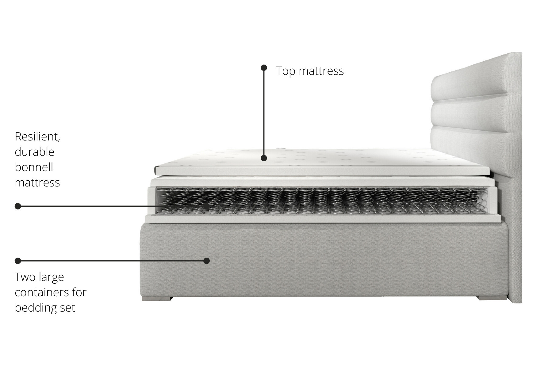 Postel se skládá z několika různých vrstev, kdy každá plní určitou funkci. Nejdůležitější částí postele je spodní rám, který tvoří dřevěný dělený box - úložný prostor postele. Na tomto dřevěném boxu je uložena kvalitní bonelová matrace. Na matraci je umístěna svrchní matrace neboli topper. Boxspring Sofia se vyrábí ve třech rozměrech.