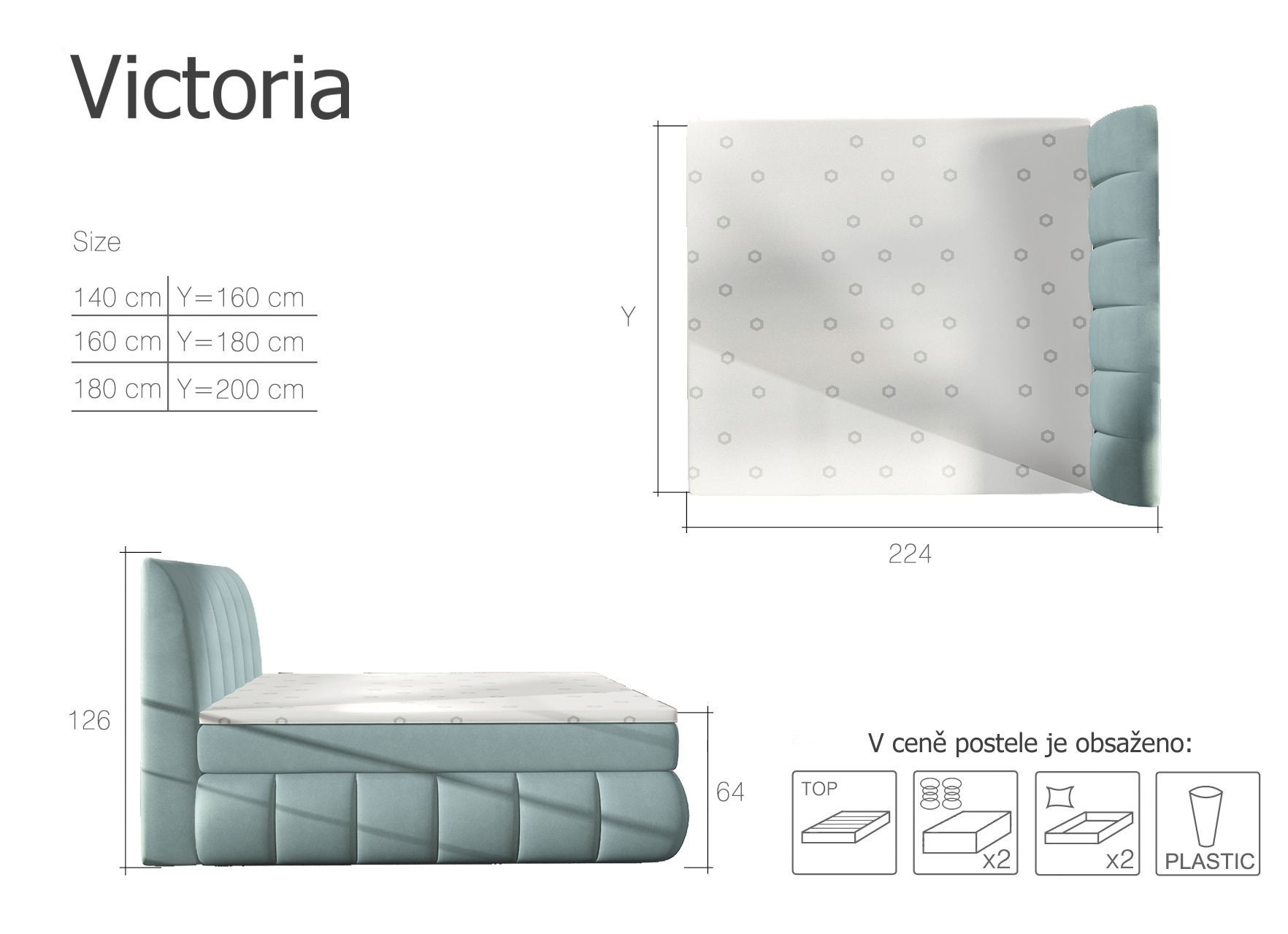 Postel se skládá z několika různých vrstev, kdy každá plní určitou funkci. Nejdůležitější částí postele je spodní rám, který tvoří dřevěný dělený box - úložný prostor postele. Na tomto dřevěném boxu je uložena kvalitní bonelová matrace. Na matraci je umístěna svrchní matrace neboli topper. Boxspring Victoria se vyrábí ve třech rozměrech.