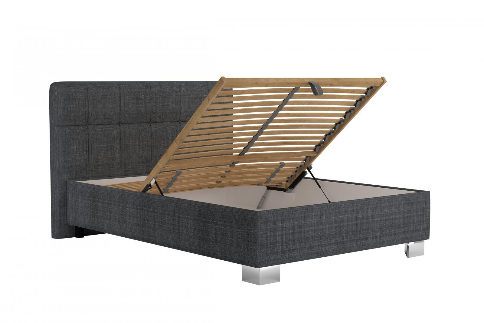 Moderní postel, která se hodí nejen do studentských nebo dětských pokojů, ale také do menších ložnic. Základem lůžka je 28 lamelový rošt s mechanickým polohováním hlavy a nohou (7 poloh hlavy, 1 poloha nohou), s nastavením tuhosti lamel a s popruhem proti přetížení. Rošt se skládá z 28 lamel uložených ve výkyvných kaučukových pouzdrech. Snadnější manipulaci při otevírání úložného prostoru zajišťují plynové písty. Součástí postele je úložný prostor, který se otevírá od nohou (pomocí plynových pístů). Tuto postel nabízíme také v dalších rozměrech. Zboží je dodáváno v demontu.