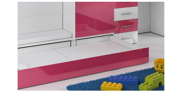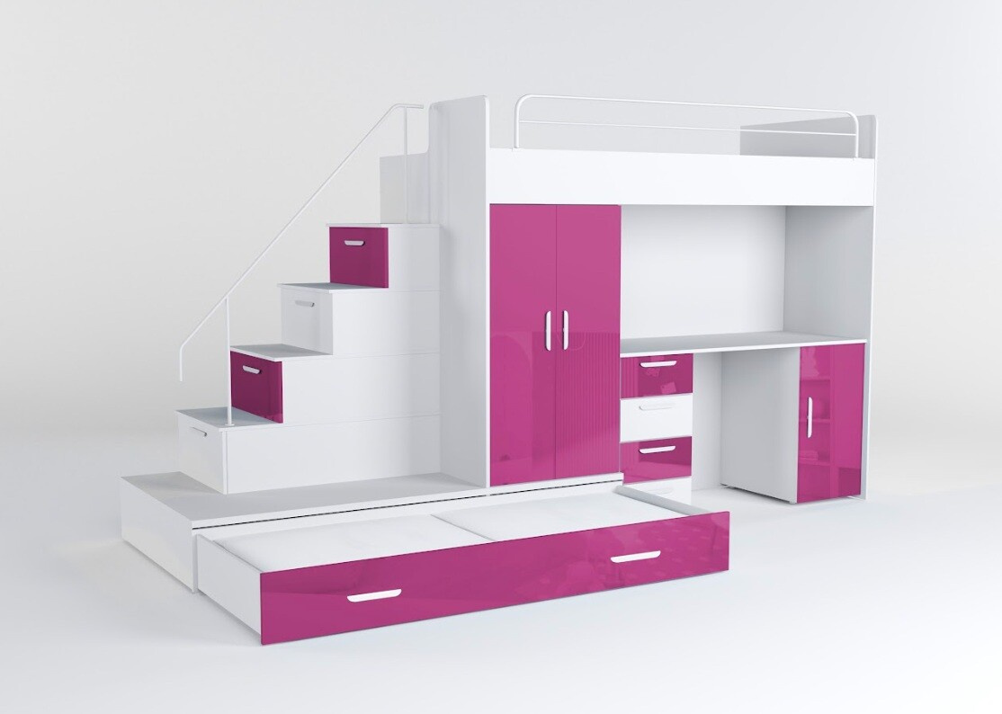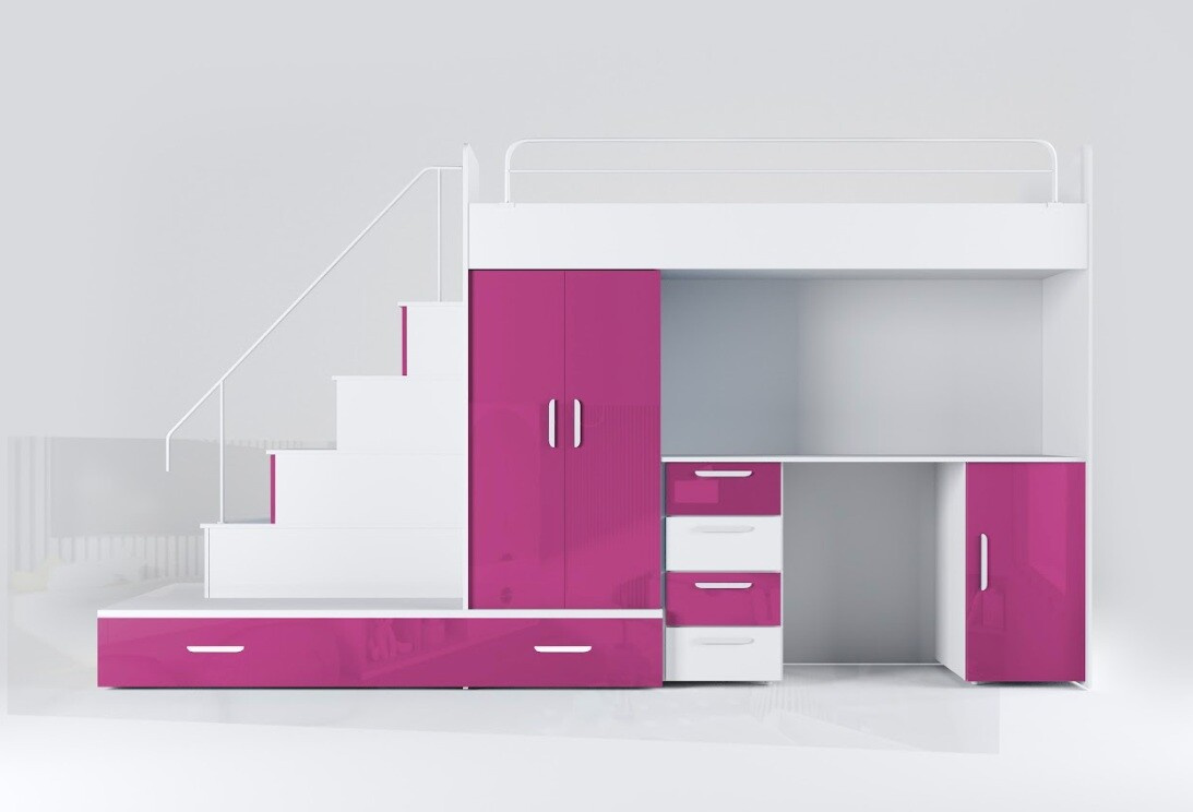 Tato postel je určená především pro osoby, které ocení moderní design, funkčnost a spoustu úložných prostorů. Patentované provedení a stabilní konstrukce postele Vám zaručuje bezpečí pro Vaše děti. Schody v sobě ukrývají spoustu úložného prostoru. Barevné provedení dvířek je v lesku a schůdky lze objednat jak na pravou tak i levou stranu (stranu schodů určujeme z čelního pohledu). Nosnost lůžka je 100 kg, nosnost schodu je 55 kg. Pod postelí se nachází psací stůl se šuplíky i šatní skříň včetně velkého výsuvného úložného šuplíku. K této posteli je možnost dokoupit další nábytek a utvořit tak krásný dětský pokoj. Uvedená úvodní fotografie je v pravém provedení.