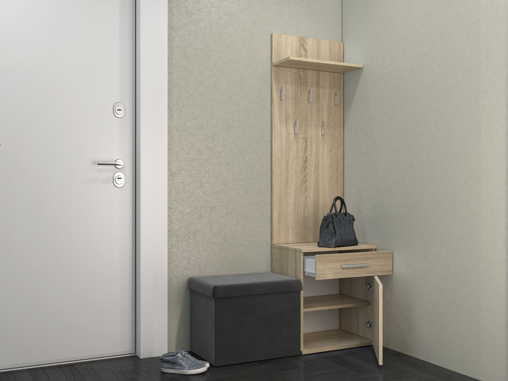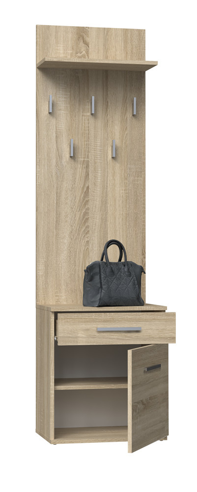 Dobře organizovaný vstupní prostor bytu se neobejde bez funkční předsíňové stěny. Předsíňová stěna do vstupní haly nabízí dostatek háčků na odložení šatstva a úložný prostor tvořený botníkem.