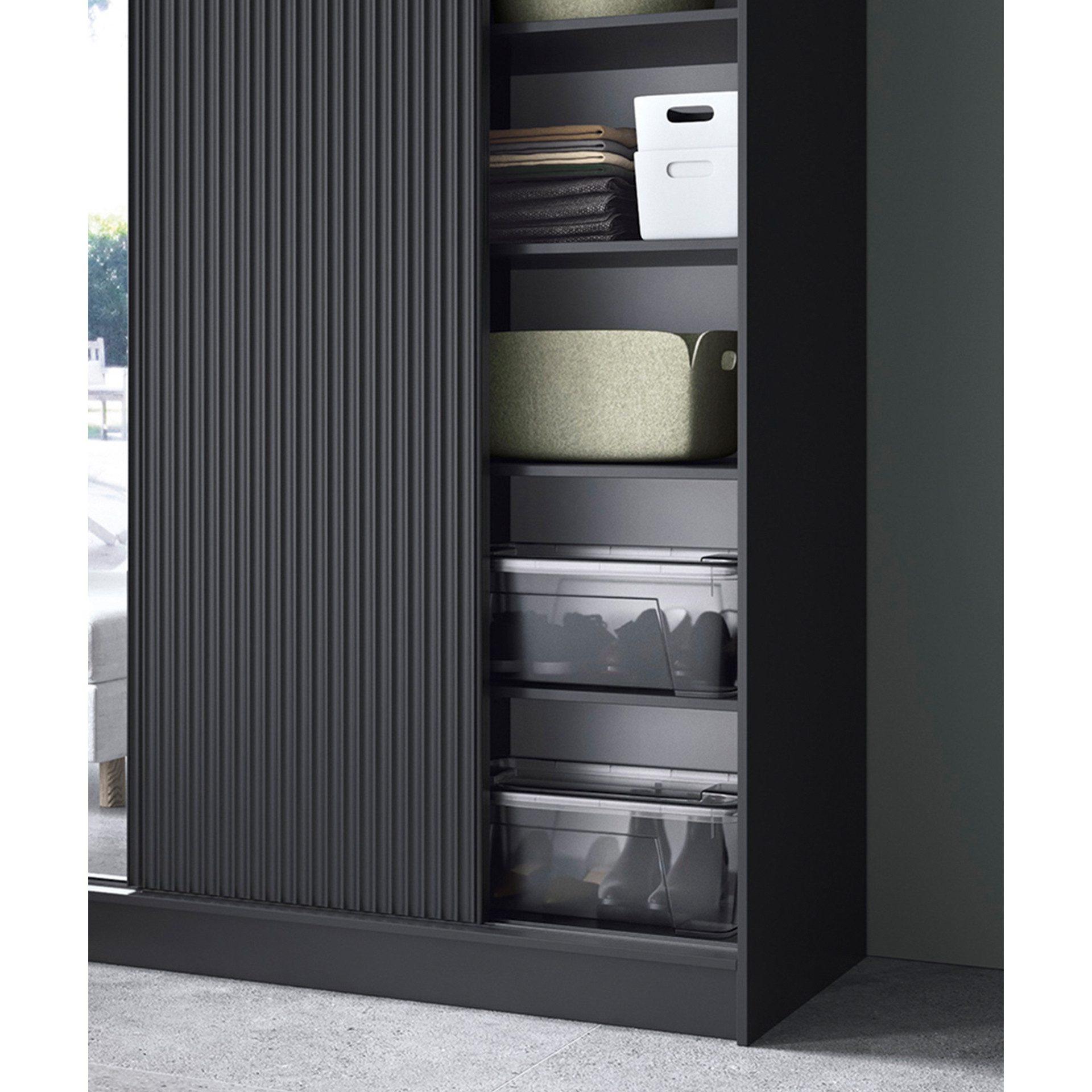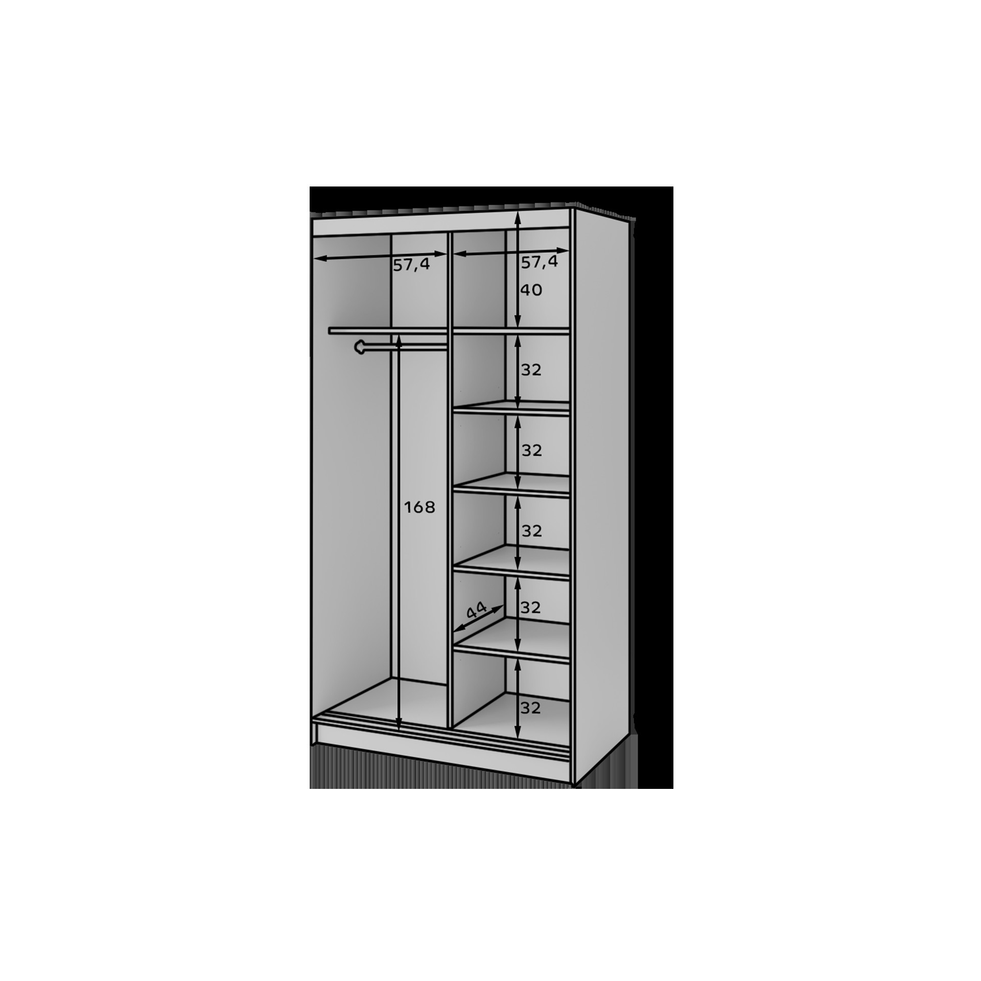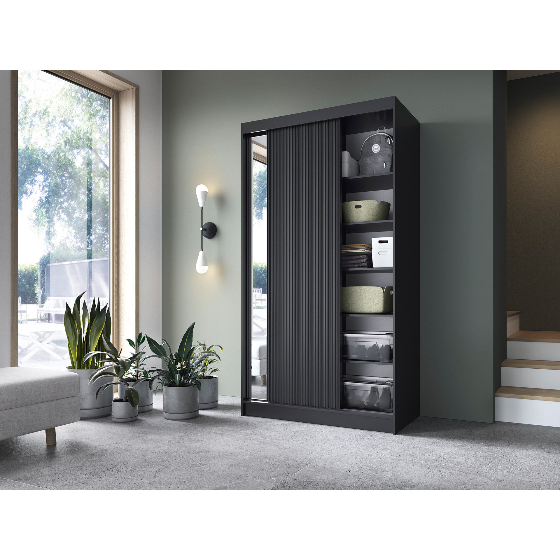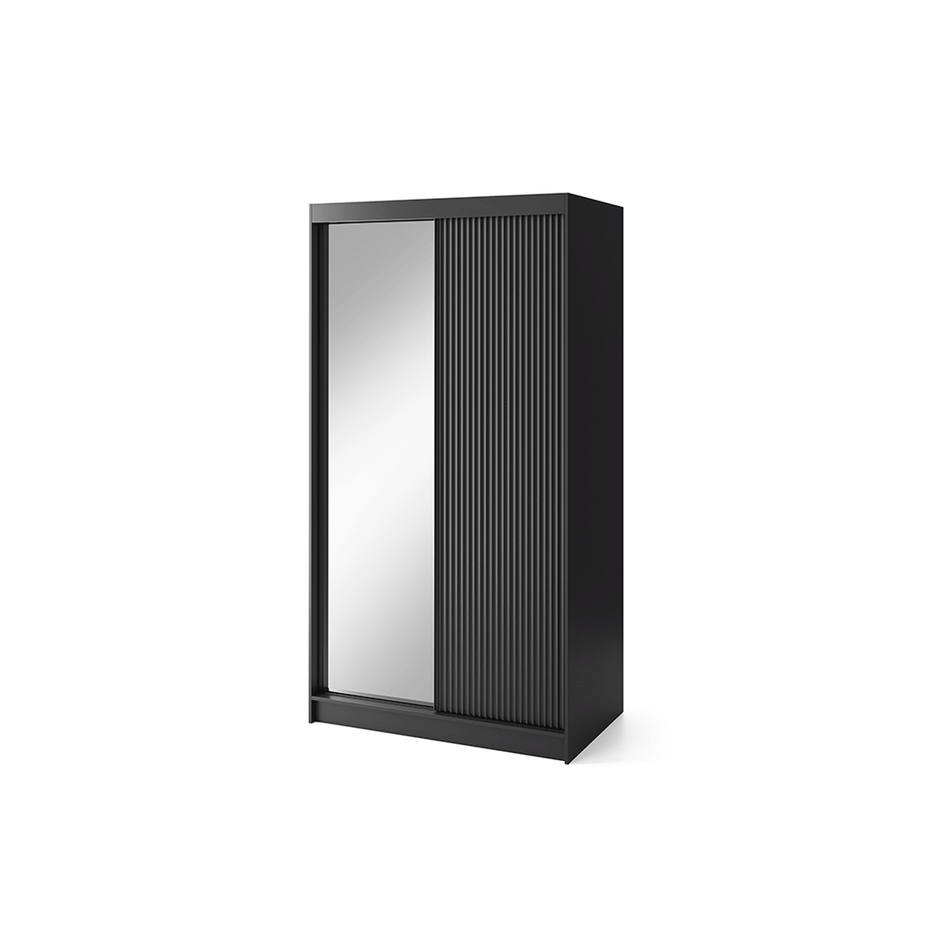 The Prescco sliding wardrobe in the version with a mirror is an exceptional and practical storage solution that not only organizes space but also adds elegance and brightens the interior. This functional wardrobe has been designed with maximum user comfort and aesthetics in mind. With dimensions of 60 cm in depth, 120 cm in width, and 220 cm in height, this wardrobe provides ample space for storing a variety of items. Its construction is based on a solid 16 mm thick MDF board, ensuring not only durability but also an aesthetic appearance. The ABS edge on the edges of the body provides additional protection against damage, preserving its attractive look. The elegant black color of the wardrobe combined with the mirror creates a modern and spacious interior. The sliding doors with a mirror not only visually enlarge the room but also facilitate the choice of the appropriate outfit and add extra brilliance to the interior. Two sliding doors allow convenient access to the interior of the wardrobe, and inside there are six shelves, each capable of holding up to 10 kg. This is the ideal place for storing clothes, accessories, or other small items. Additionally, the included rods allow for convenient hanging of clothes, contributing to maintaining order and aesthetics. The 0.5 cm high plastic feet with black coating and the same color of the sliding rail ensure stability. The Prescco variant with a mirror is not only a practical storage solution but also a decorative element that brings elegance and modernity to your interior. The elegant design and functionality of this wardrobe make it the center of organization in your space.
