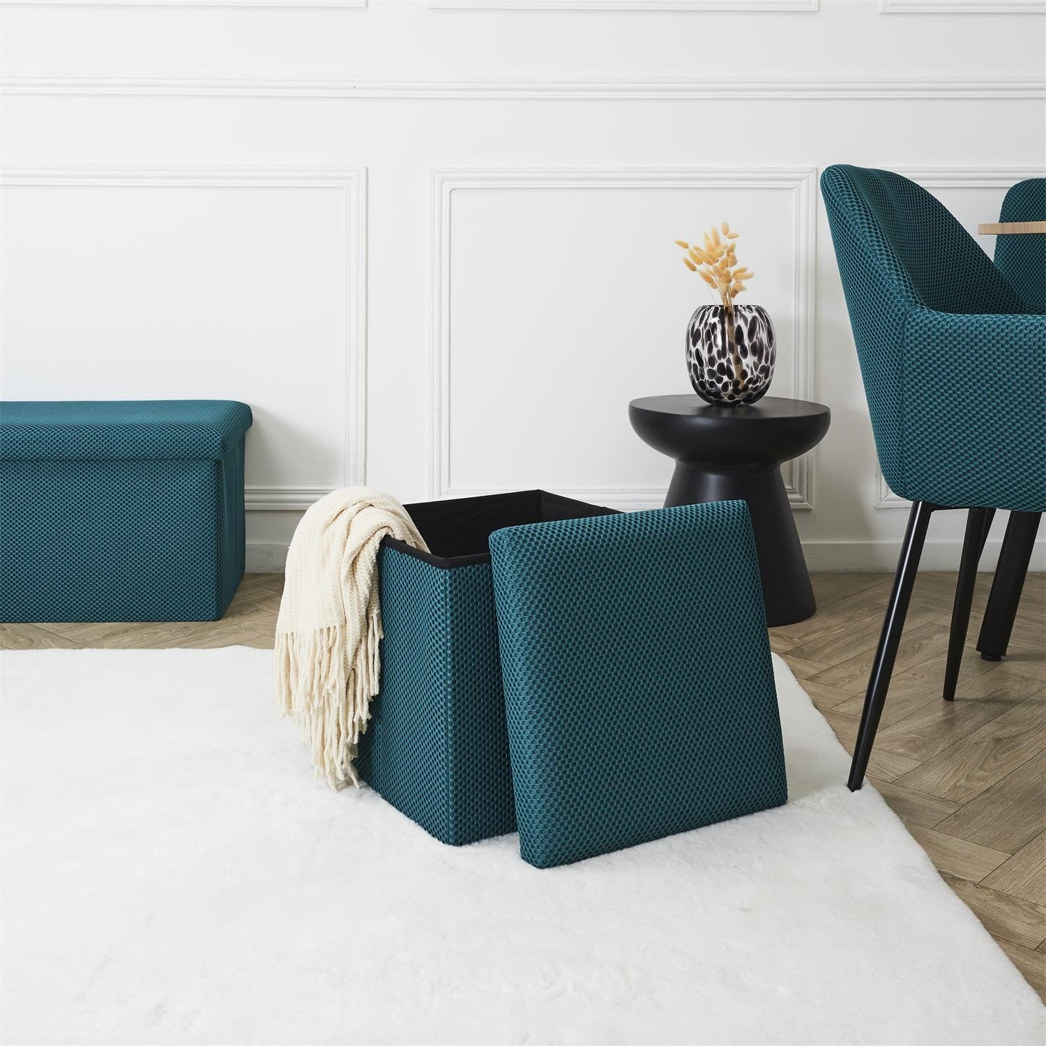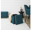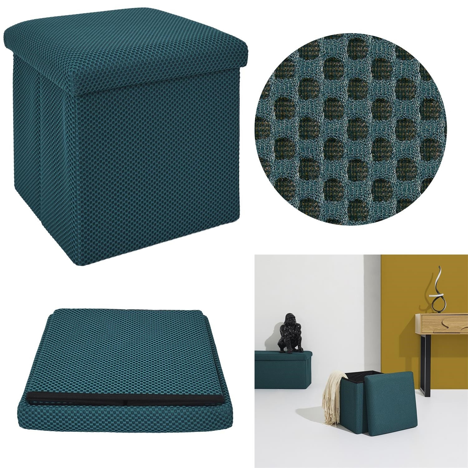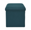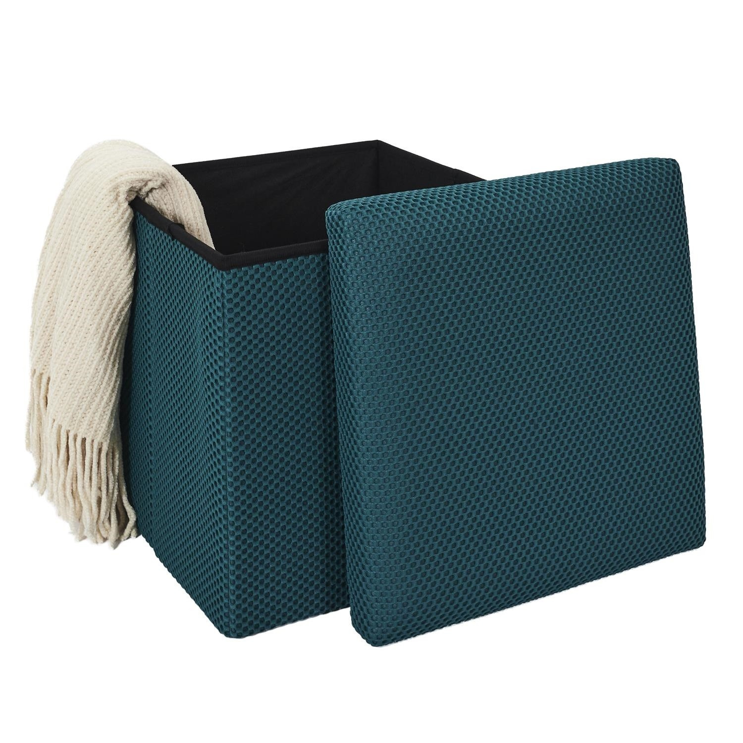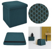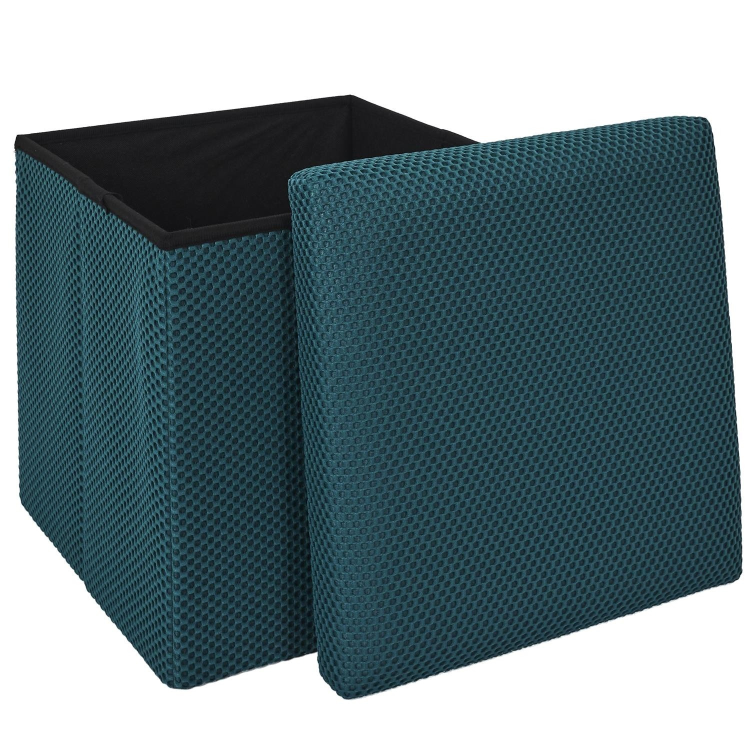 Összecsukható puff tárolóval minden diáklakás elengedhetetlen kelléke, vagy azok számára, akiknek további ülőhelyre és tárolóhelyre van szükségük. Puff, amely tartós MDF lapból készült kerettel rendelkezik, amely garantálja a bútor maximális terhelhetőségét akár 110 kg-ig. A puff összecsukható, amikor nem használjuk. Szétnyitva rengeteg helyet biztosít kisebb tárgyak, valamint nagyobb dolgok, mint például takarók, cipők vagy könyvek tárolására. A puff érdekes, háromdimenziós szövettel volt díszítve. Szövet 100% poliészter.