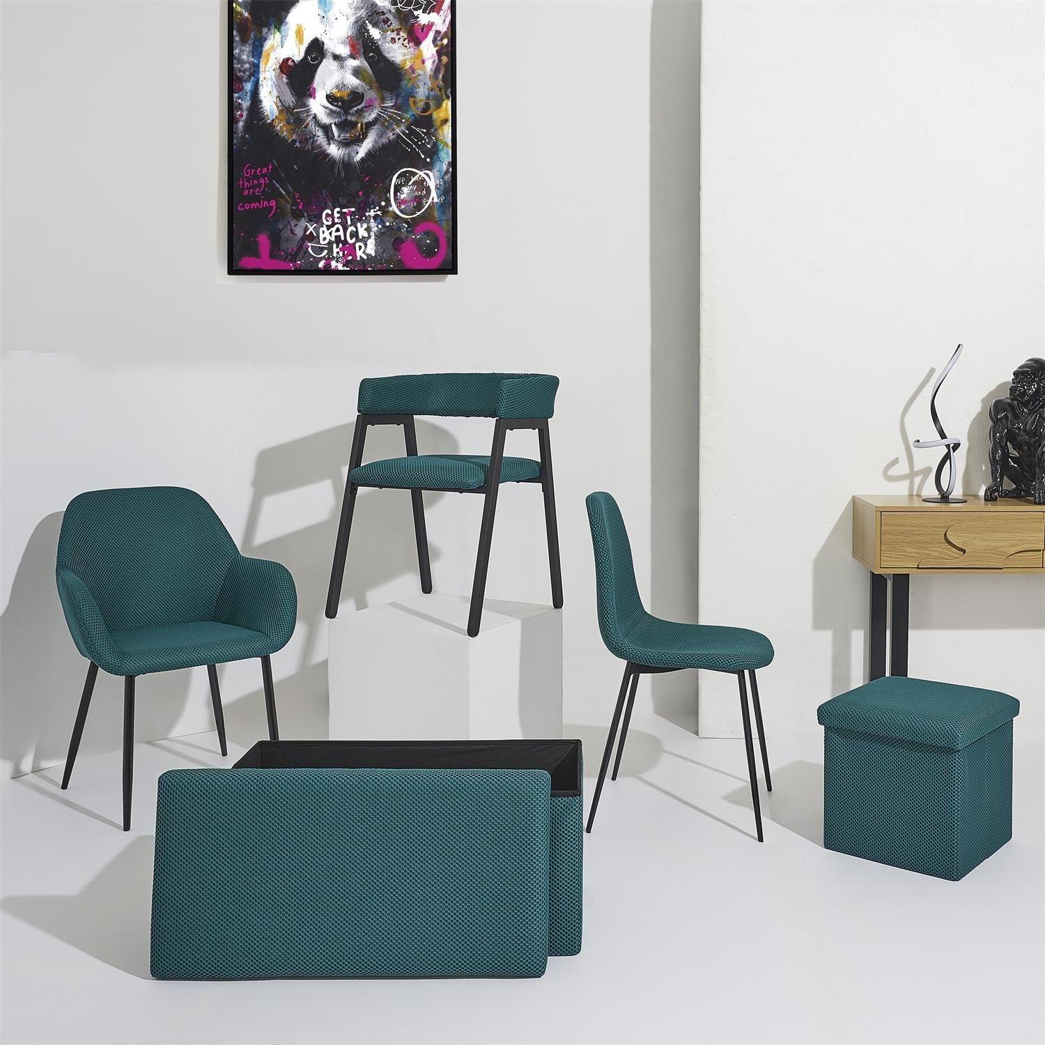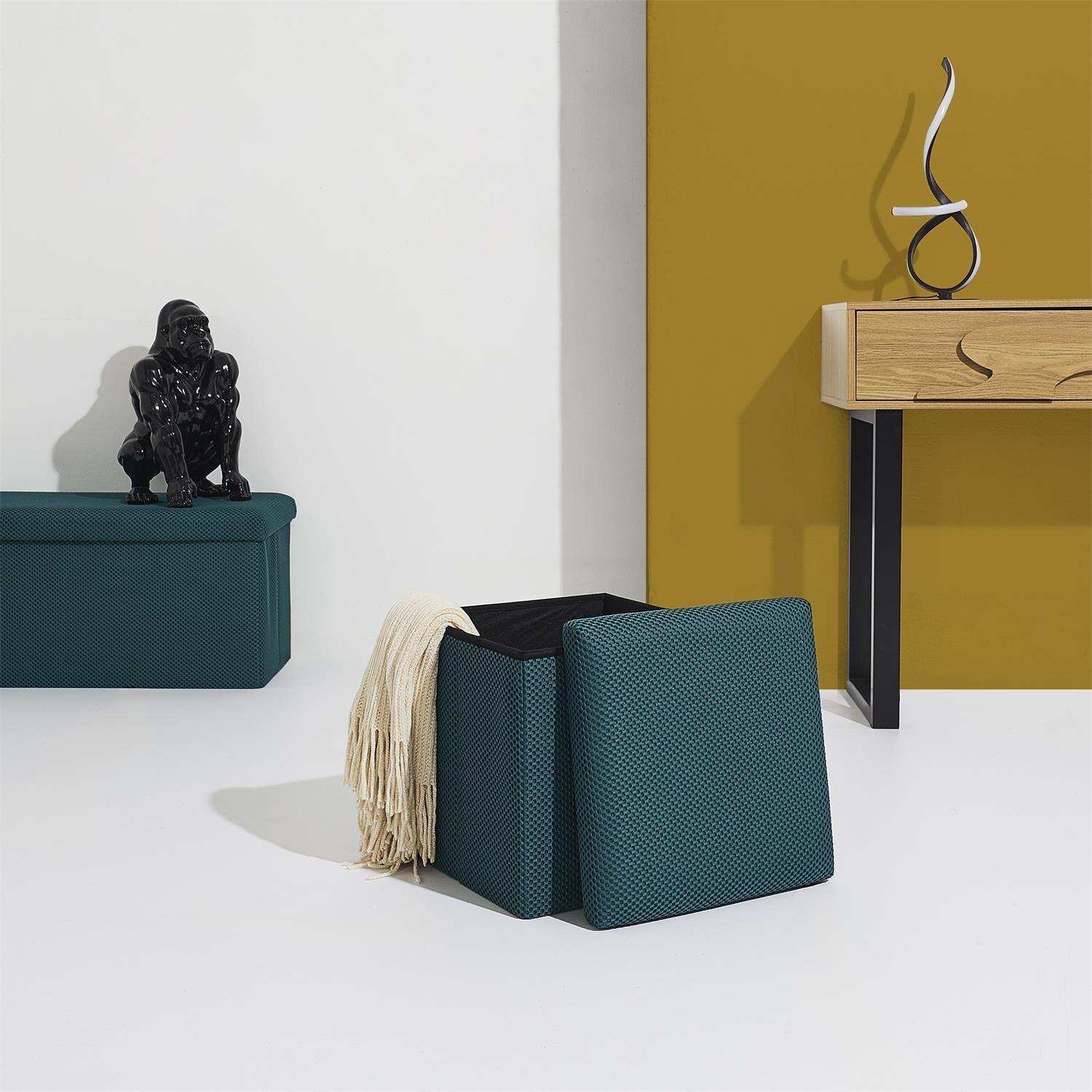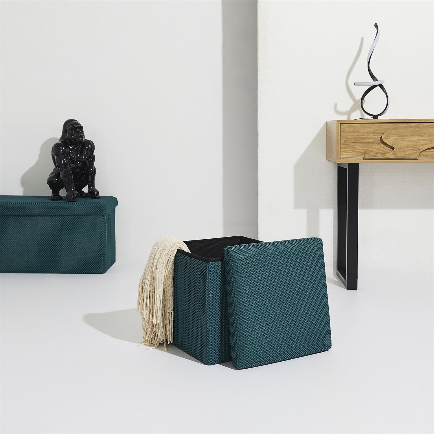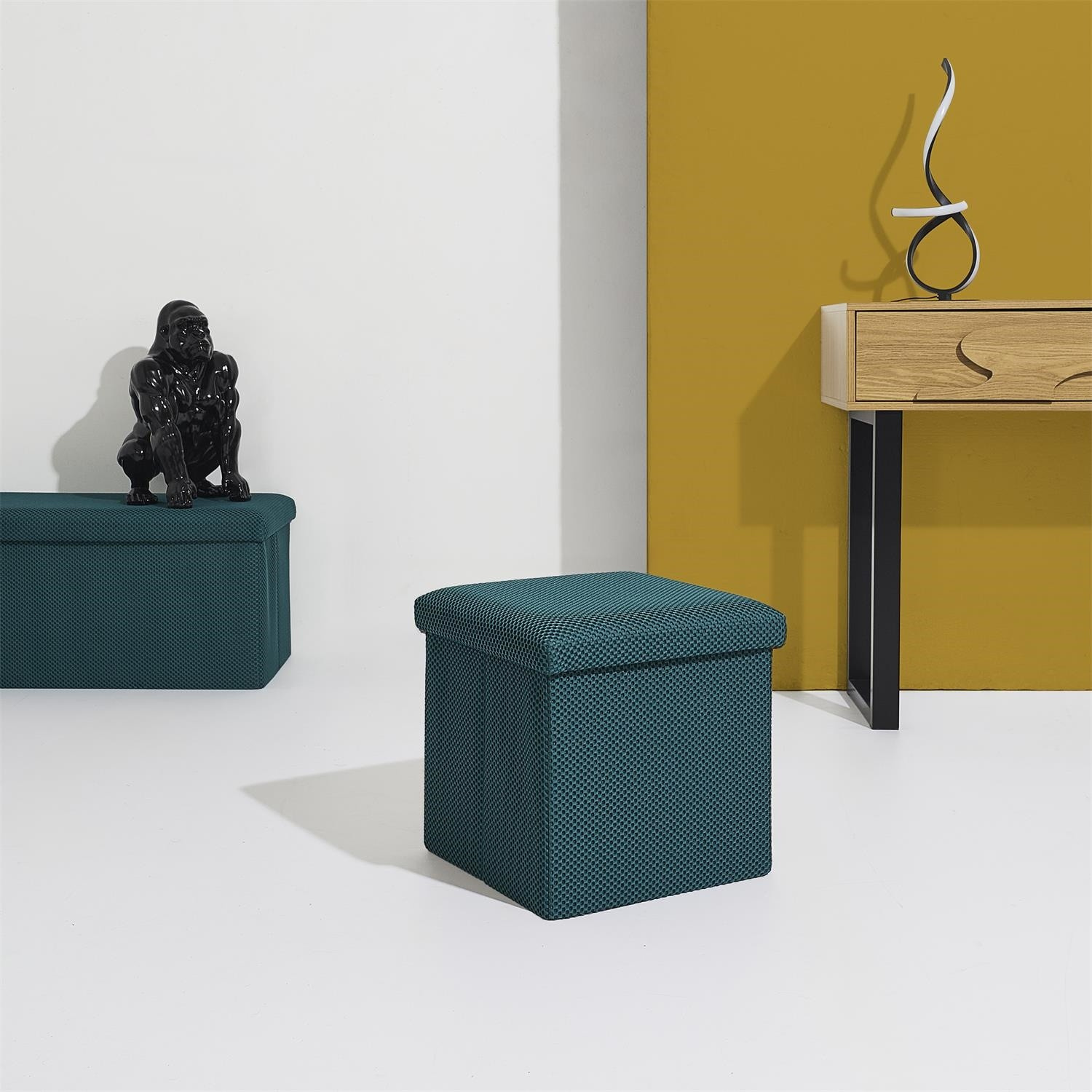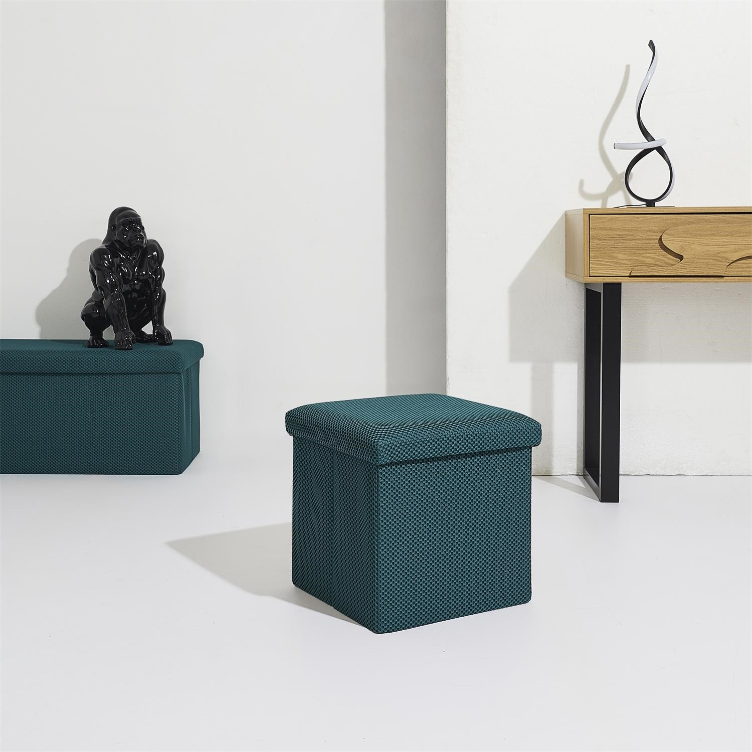 Összecsukható puff tárolóval minden diáklakás elengedhetetlen kelléke, vagy azok számára, akiknek további ülőhelyre és tárolóhelyre van szükségük. Puff, amely tartós MDF lapból készült kerettel rendelkezik, amely garantálja a bútor maximális terhelhetőségét akár 110 kg-ig. A puff összecsukható, amikor nem használjuk. Szétnyitva rengeteg helyet biztosít kisebb tárgyak, valamint nagyobb dolgok, mint például takarók, cipők vagy könyvek tárolására. A puff érdekes, háromdimenziós szövettel volt díszítve. Szövet 100% poliészter.