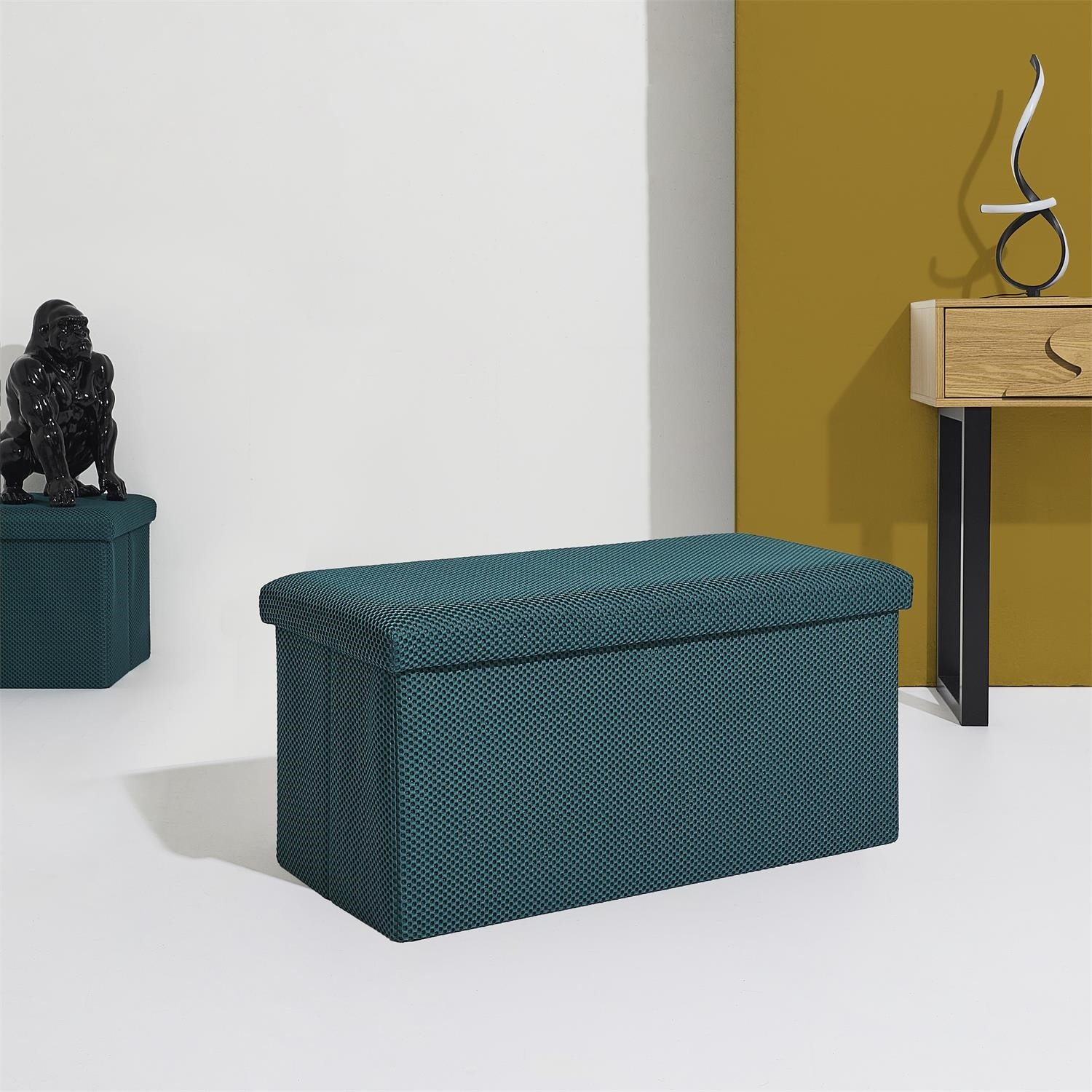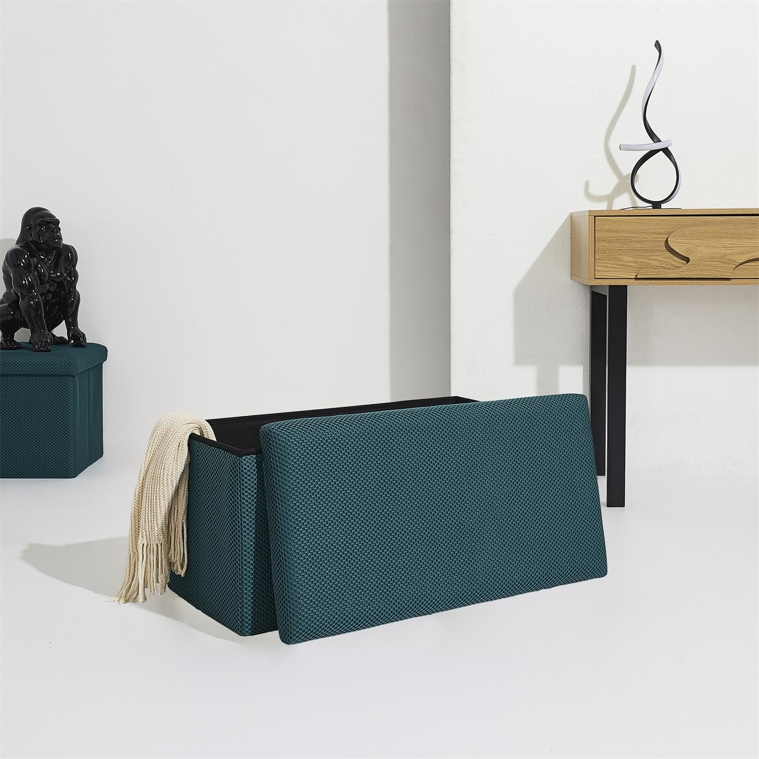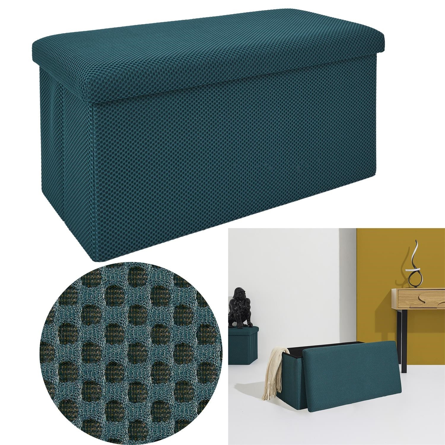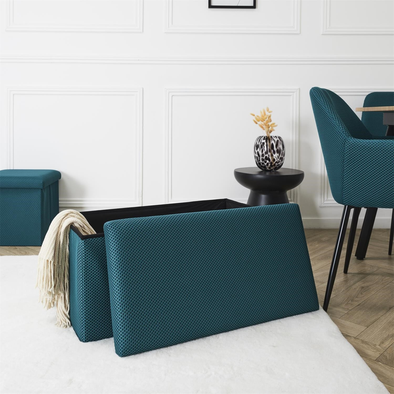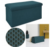 Összecsukható puff tárolóval minden diáklakás elengedhetetlen kelléke, vagy azok számára, akiknek további ülőhelyre és tárolóhelyre van szükségük. Puff, amely tartós MDF lapból készült kerettel rendelkezik, amely garantálja a bútor maximális terhelhetőségét akár 110 kg-ig. A puff összecsukható, amikor nem használjuk. Szétnyitva rengeteg helyet biztosít kisebb tárgyak, valamint nagyobb dolgok, mint például takarók, cipők vagy könyvek tárolására. A puff érdekes, háromdimenziós szövettel volt díszítve. Szövet 100% poliészter.
