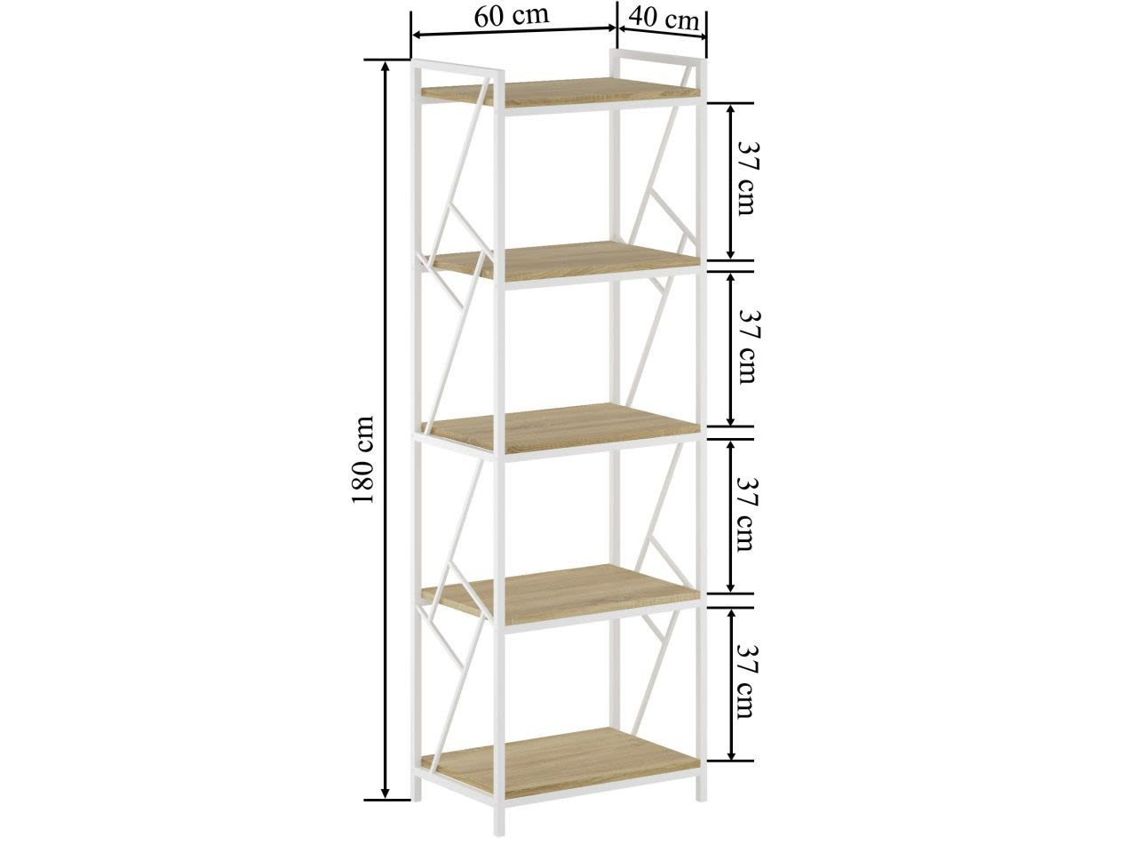 MÉRETEK: - mélység: 40 cm - szélesség: 60 cm - magasság: 180 cm ANYAG: - polcok: laminált forgácslap - keret: porszórt festett fém SZÍN: - polcok: természetes tölgy - keret: fehér