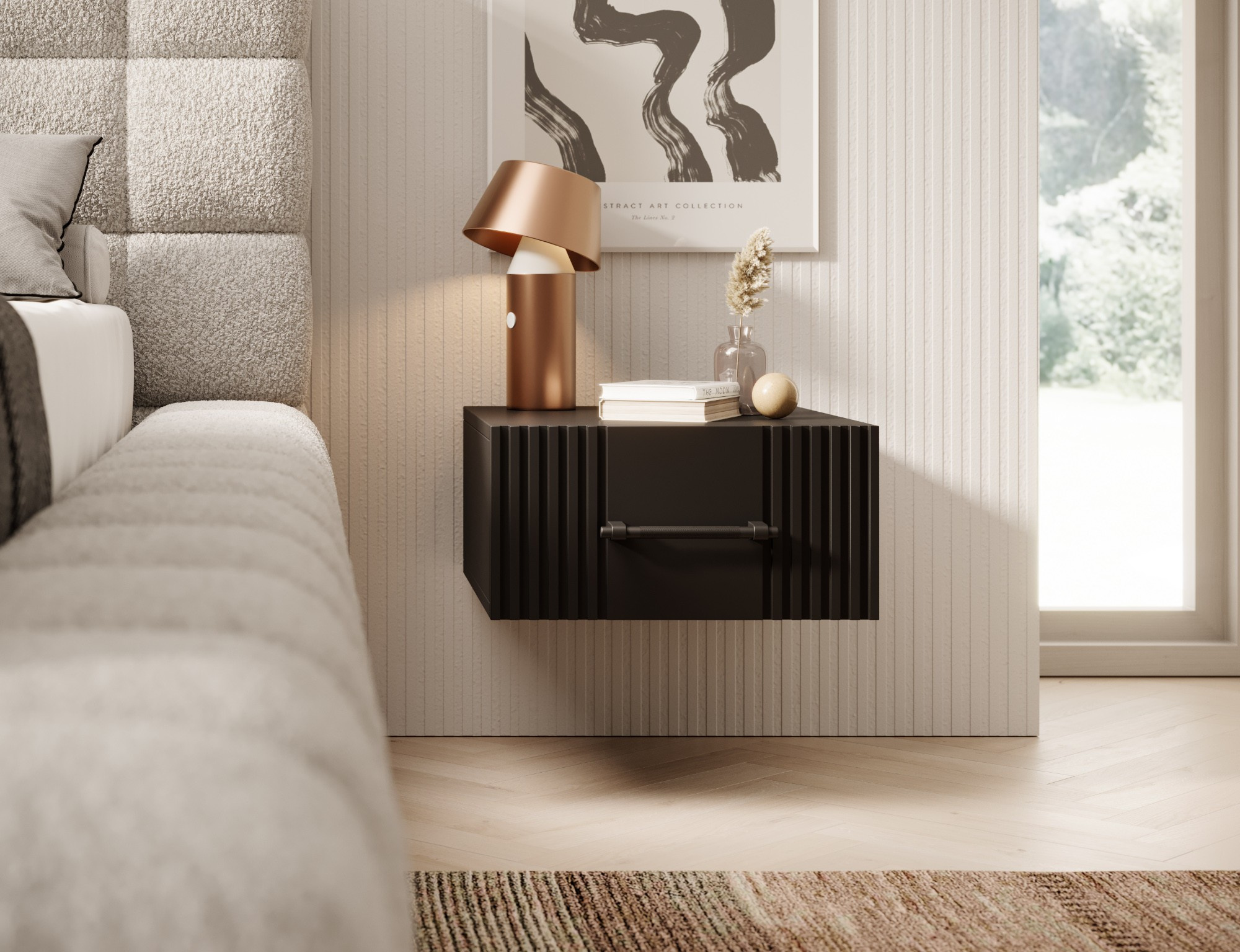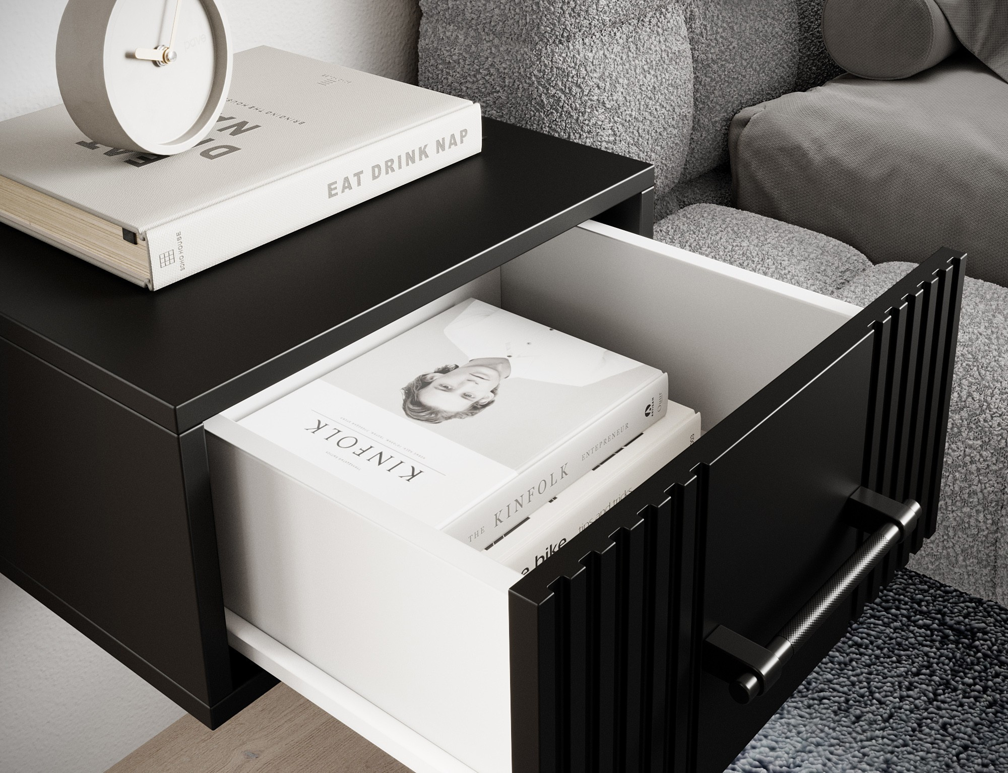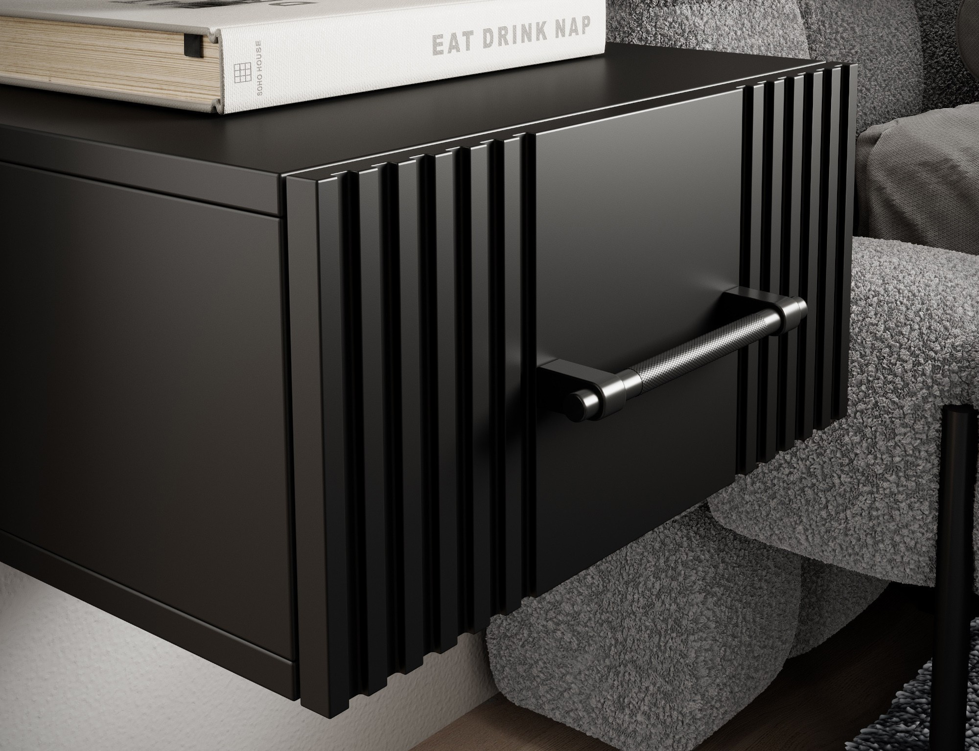 The nightstand from the Raftt Collection is the perfect combination of raw loft style and practical design. Its solid construction is made from laminated particleboard, with grooved fronts made of foil-coated MDF that highlight the industrial character of the furniture. Equipped with black aluminum handles, the nightstand harmoniously fits into modern interiors. The drawers are mounted on roller guides, providing smooth and easy use, offering space for essential items. The additional advantage of wall-mounting increases stability and safety. The Raftt nightstand fits perfectly in loft, industrial, and modern interiors, bringing style and functionality.