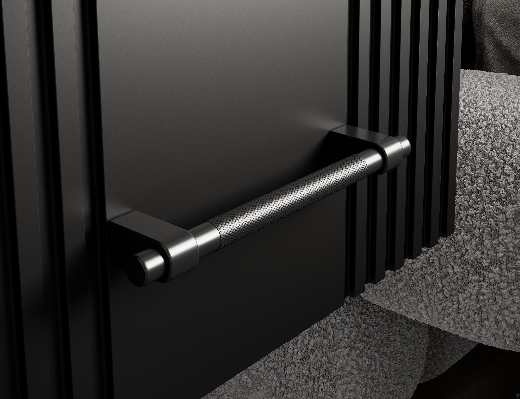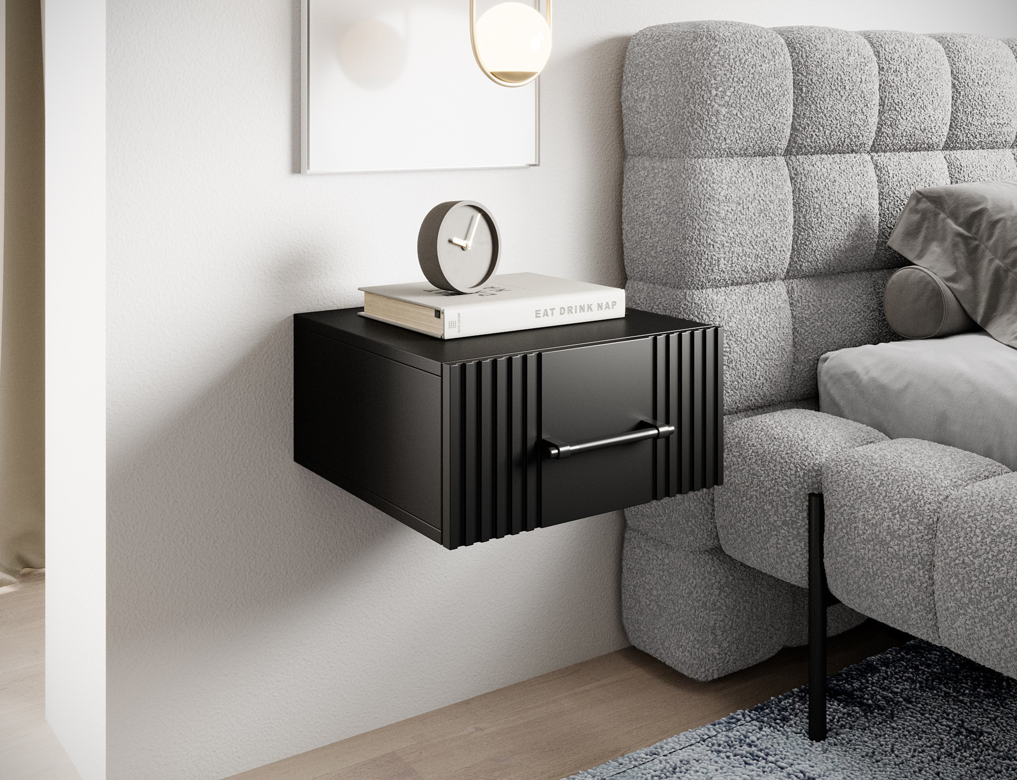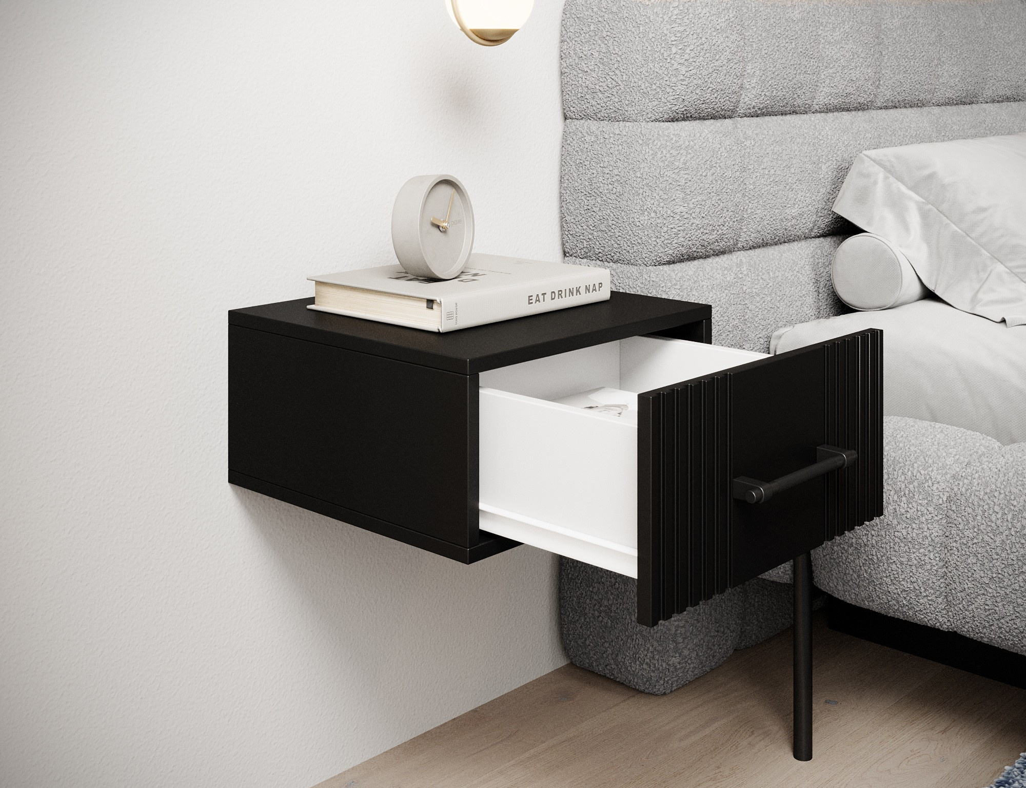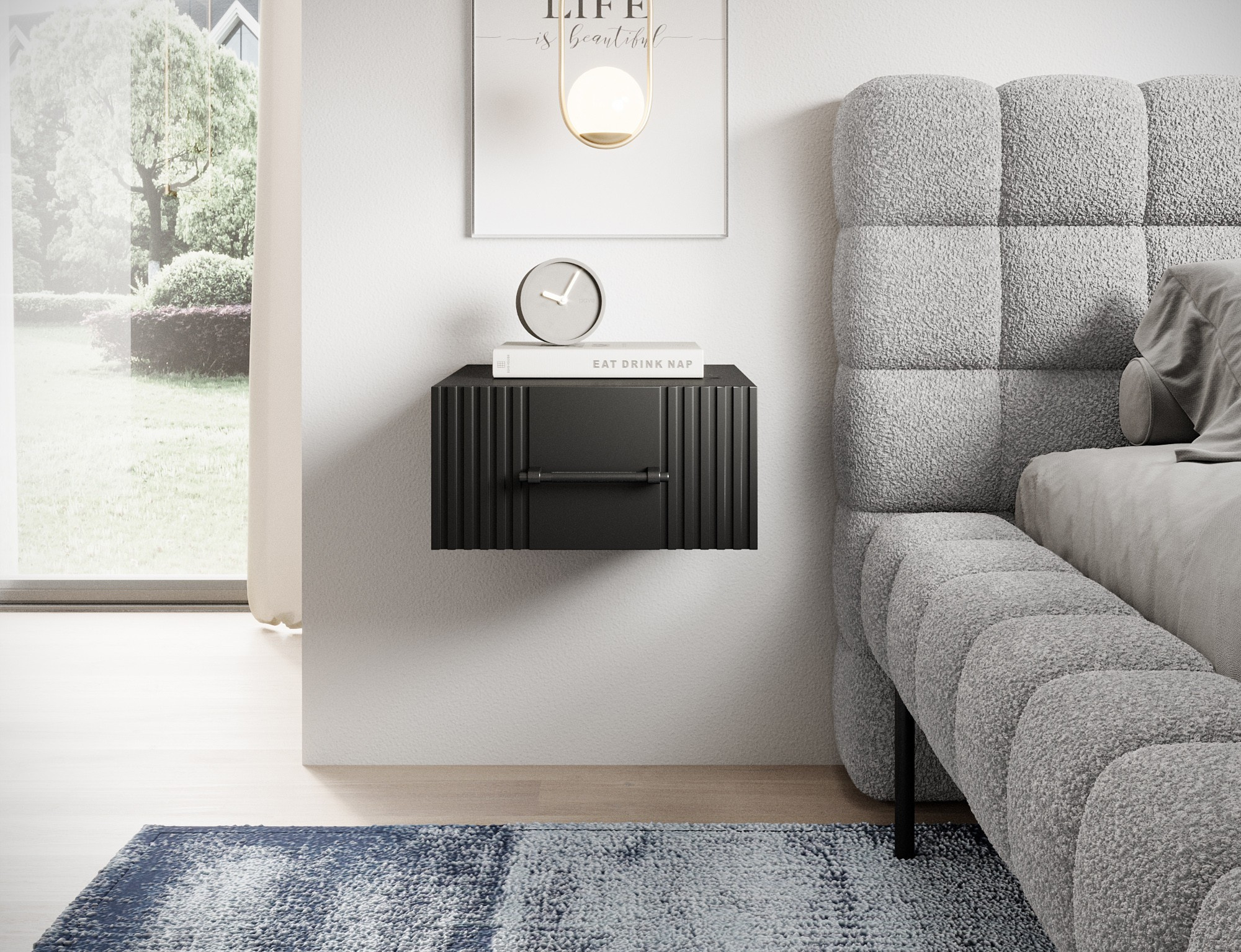 The nightstand from the Raftt Collection is the perfect combination of raw loft style and practical design. Its solid construction is made from laminated particleboard, with grooved fronts made of foil-coated MDF that highlight the industrial character of the furniture. Equipped with black aluminum handles, the nightstand harmoniously fits into modern interiors. The drawers are mounted on roller guides, providing smooth and easy use, offering space for essential items. The additional advantage of wall-mounting increases stability and safety. The Raftt nightstand fits perfectly in loft, industrial, and modern interiors, bringing style and functionality.