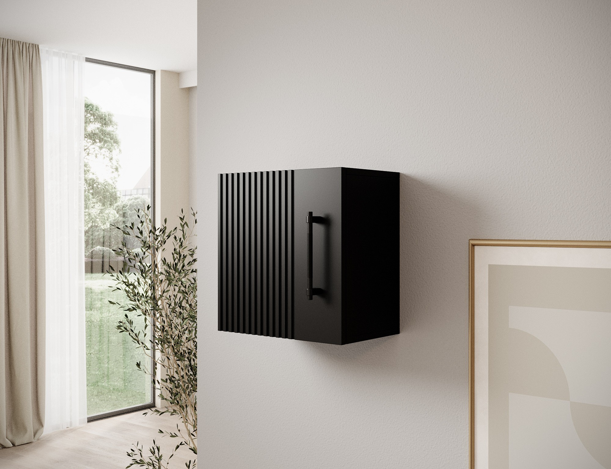 The wall cabinet from the Raftt Collection is the perfect solution for those who appreciate modern and industrial styles. Made from laminated particleboard with a grooved front made of foil-coated MDF, it stands out with an elegant finish and the raw aesthetics of loft design. The piece is equipped with hinged doors mounted on soft-close hinges, ensuring silent and comfortable use. Black aluminum handles complement the overall design, emphasizing the industrial character of the cabinet. The option to mount it on the wall makes it suitable for various spaces—living rooms, bedrooms, or offices. It’s an ideal blend of functionality and aesthetics, perfect for any loft, industrial, or modern interior.