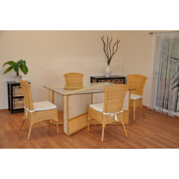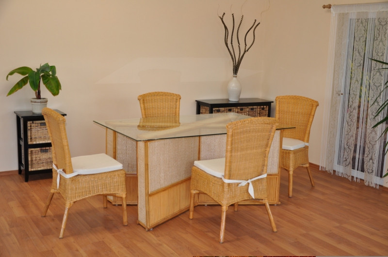 Výprodej!!!! Ratanový nábytek - luxusní ratanová sedací souprava je vyrobena z přírodního ratanu s barvou konstrukce \"medová\", obsahuje 4 křesla, stůl ve tvaru X se sklem a kompletní sadu polstrů dle obrázku výrobku | masivní ratanová konstrukce s ratanovým výpletem z proutků průměr 4 mm,barva konstrukce medová, rozměr křesla 58x49x98 cm, stůl 160x100 cm, výška stolu 77 cm, nosnost křesla 120 kg, Souprava byla vystevena na firemní prodejně.