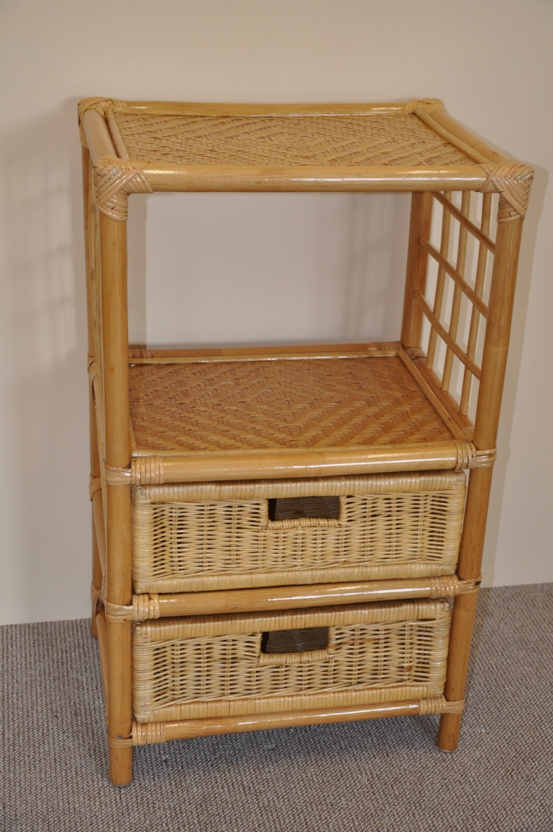 Ratanová komoda se 2 praktickými zásuvkami a otevřenou policí. | Barva ratanové konstrukce i ratanového výpletu je medová. Zásuvky mají dřevěnou kostru a vypleteny jsou přírodním ratanem. Velikost komody je 45x36x75 cm