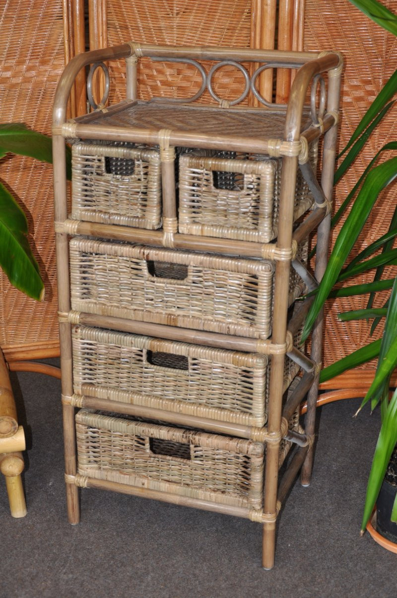 Ratanový nábytek - ratanová komoda 3+2 zásuvky. Konstrukce i výplet jsou vyrobeny z přírodního ratanu. Komoda je praktickým doplňkem v domácnosti pro odkládání různých věcí nebo jako prádelník | Velikost výrobku 45x35x96 cm. Barva ratanové konstrukce i výpletu je hnědá.